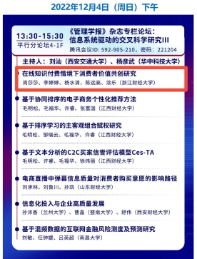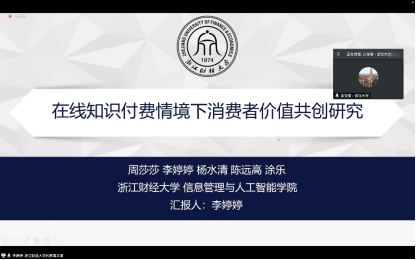 20级管理科学与工程专业研究生李婷婷在“《管理学报》杂志专栏论坛:信息系统驱动的交叉科学研究”分论坛以“在线知识付费情境下消费者价值共创研究”为题进行了论文口头报告,并与参会专家学者们进行了深入的交流和讨论。