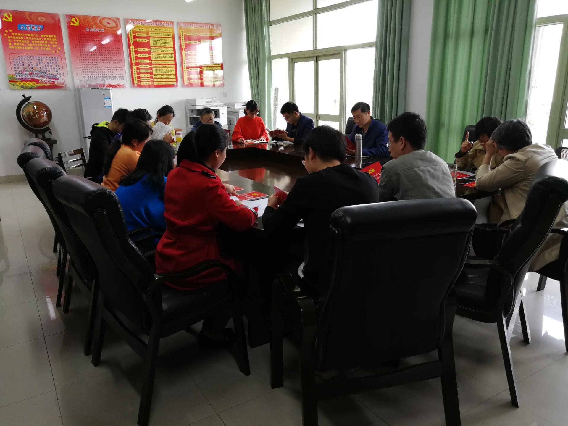 之后,党员老师们集体学习了新修订的《中国共产党纪律处分条例》。《中国共产党纪律处分条例》于2015年10月由中共中央印发,此次修订为时隔近三年后,党中央再向全党划出新的纪律“底线”。新修订的《中国共产党纪律处分条例》自2018年10月1日实施执行。大家通过研读一致认为,新修订的《条例》内容更加丰富,新增或修订了诸多纪律“高压线”,使得条例更明确、更清晰、更细化。每一名党员都应该遵照这些基本要求,严格按照党章党规办事,自觉接受党的纪律和规矩约束,牢固树立政治意识、大局意识、核心意识、看齐意识,坚持正确的人才培养方向,防止宗教向校园渗透,担负起全面从严治党的政治责任。