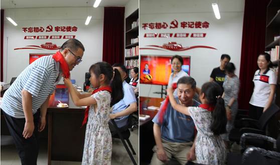 教工支部还特别邀请了两位党龄分别是26年和25年的资深党员教授——王继林同志和赵辉同志,请他们给在座的年轻党员们分享了自己的在党心路历程和经验体会。两位党员教授的发言深刻地传递了敬业、笃学、善教的精神,正能量满满,令人受益匪浅。同时,一位共产主义接班人为两位资深党员佩戴了红领巾,表达了红领巾心向党,致敬前辈的决心。所有人一下子仿佛重新回到了年轻时代,共同传承红色基因,因为无关年龄,我们都是共产主义接班人!