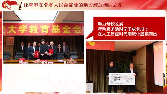 在“让青春在党和人民最需要的地方绽放绚丽之花” 的主题中,朱凌讲述了我校毕业生谢如栋响应国家号召艰苦创业反哺母校的动人故事。