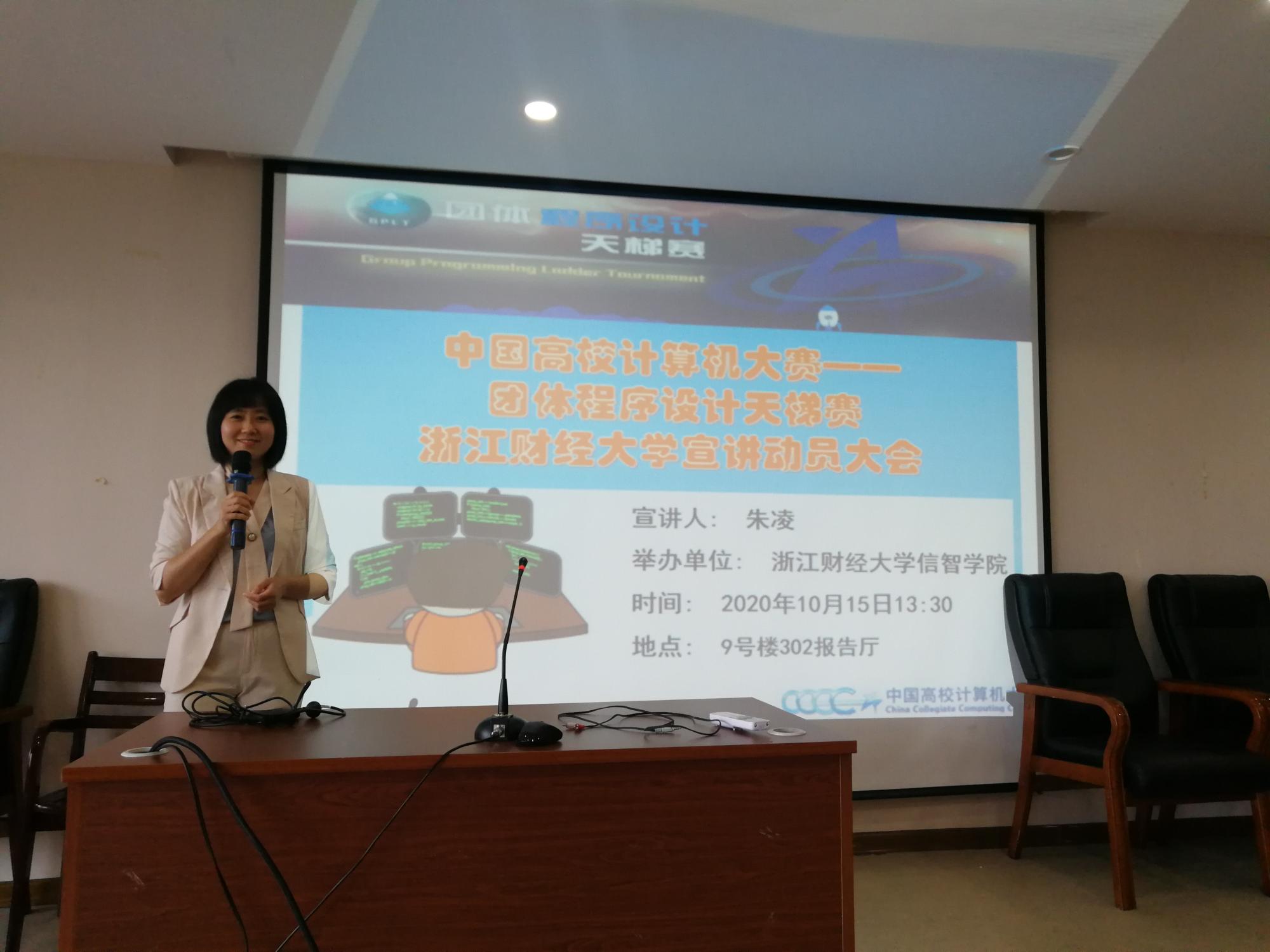 主持人朱凌老师在宣讲会上向同学们介绍了中国高校计算机大赛——团体程序设计天梯赛的简介、规程、和与众不同的赛制,以及我校往年所取得的优异成绩,并提醒同学们注意今年天梯赛组委会做出的一些新调整与改变,最后,鼓励和动员同学们积极报名参加天梯赛的全校选拔比赛,给自己多争取一个机会,让自己的青春不留遗憾。