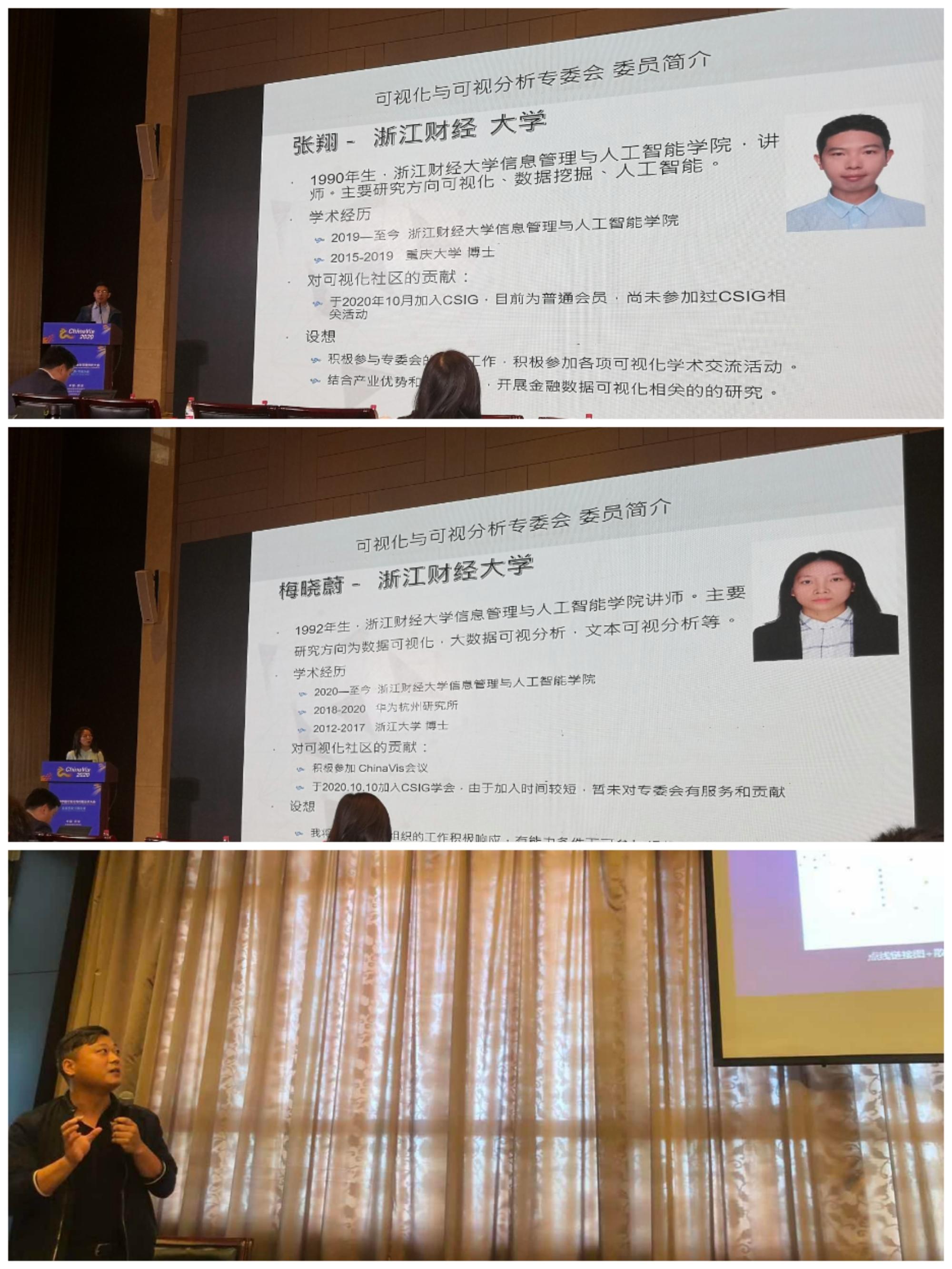 张翔、梅晓慰老师向可视化与可视分析专业委员会提交了自己的新进委员申请,并在会议上向各位委员介绍了自己的研究方向和已有相关成果。刘玉华老师在“网络与图”专题会议上宣读了大会录用的“多元网络可视分析综述”论文,并与现场同行专家进行了交流互动。