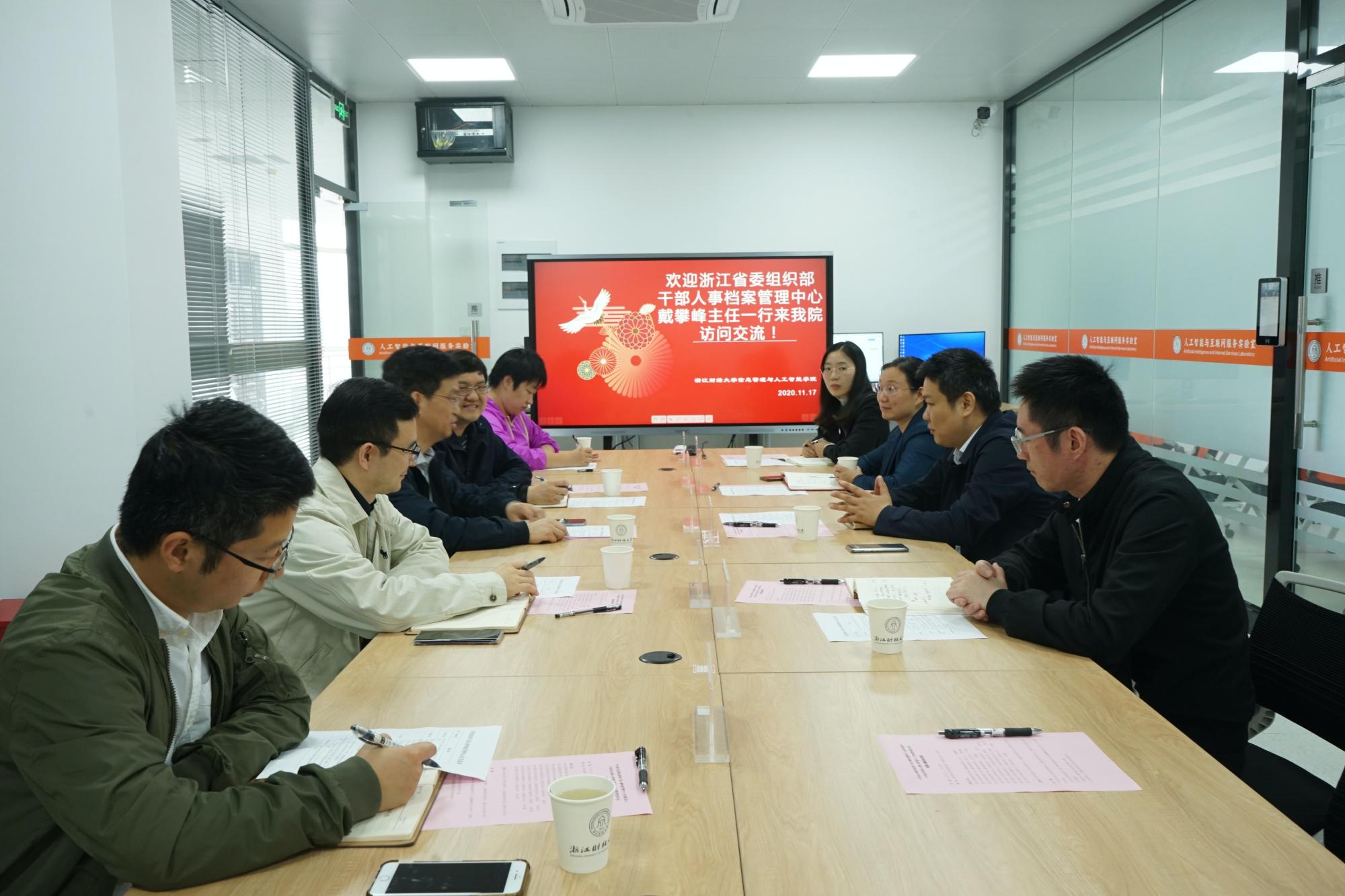11月17日,浙江省委组织部干部人事档案管理中心主任戴攀峰,副主任陈淑媛一行4人来院访问交流。校党委副书记黄建新,校党委委员、组织部、统战部部长董进才,学院院长张帅,学院党委书记徐奇伟,学院副院长陈远高等热情接待了戴攀峰主任一行。