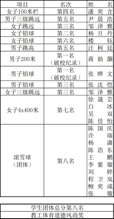 师生积极参与、奋勇拼搏,最终取得了学生团体总分第八名、教职工团体体育道德风尚奖等优异成绩,蒋勋灏和张晔文两位同学破校运会个人项目纪录。