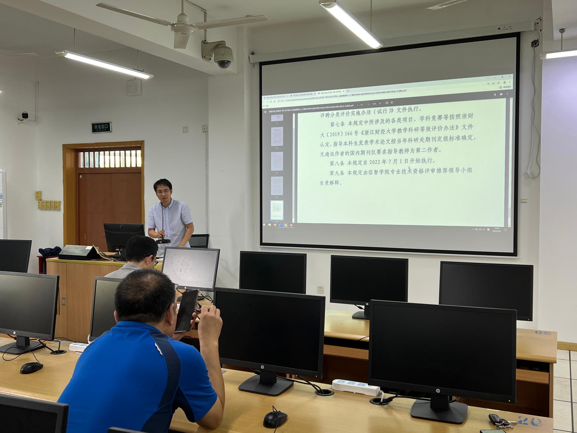 陈远高副院长讲解社会导师聘任相关要求,为参会教师解读《信息管理与人工智能学院专任教师高级专业技术职务申报条件暂行规定》重点条款与注意事项,着重提醒了文件执行时间节点。
