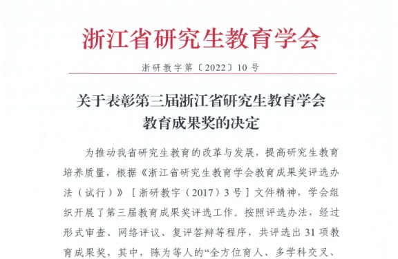 浙江省研究生教育学会教育成果奖是由浙江省研究生教育学会在2017年设立的,每两年评选一次。旨在奖励在研究生教育教学实践过程中开拓创新、取得显著成效的集体和个人,推动浙江研究生教育的改革与发展,提高研究生教育培养质量。