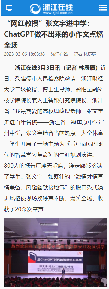 二级教授、博士生导师、盈阳金融科技学院院长兼人工智能研究院院长、浙江省“我最喜爱的高校思政课老师”张文宇走进百年名校——浙江省一级重点中学严州中学。张文宇结合当前热点,为全体高二学生开展了一场主题为《后ChatGPT时代的智慧学习革命》的生涯规划演讲。800人的报告厅座无虚席,连走廊都挤满了学生。张文宇一如既往的“激情才情真情兼备,风趣幽默接地气”的脱口秀式演讲风格使现场欢呼声不断、爆笑全场,收获了20余次掌声。