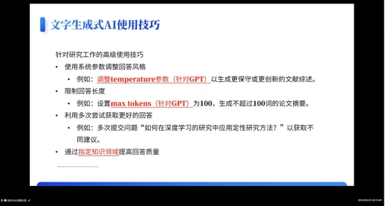 吴博士为我们详细介绍了现有的主流文字生成式AI工具,并通过检索/查资料、总结/写综述以及一些使用技巧为实际案例,展示了AI工具在科研中的应用,这些案例将为我们提供宝贵的经验和启示,帮助我们更好地运用AI技术来解决科研中的难题。