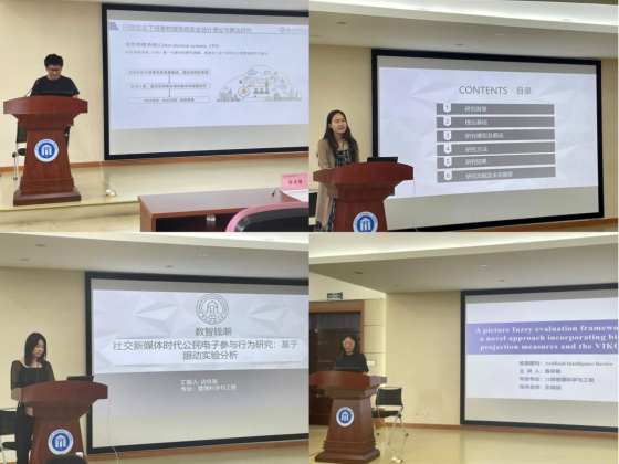 管理科学与工程研究生进行主题分享,邀请了杨水清副教授、周莎莎副教授和吴海燕博士作此次的点评专家。学院分管研究生工作副院长隆清琦进行了开幕致辞,研究生秘书杨天亦以及全体在校研究生参加了论坛。