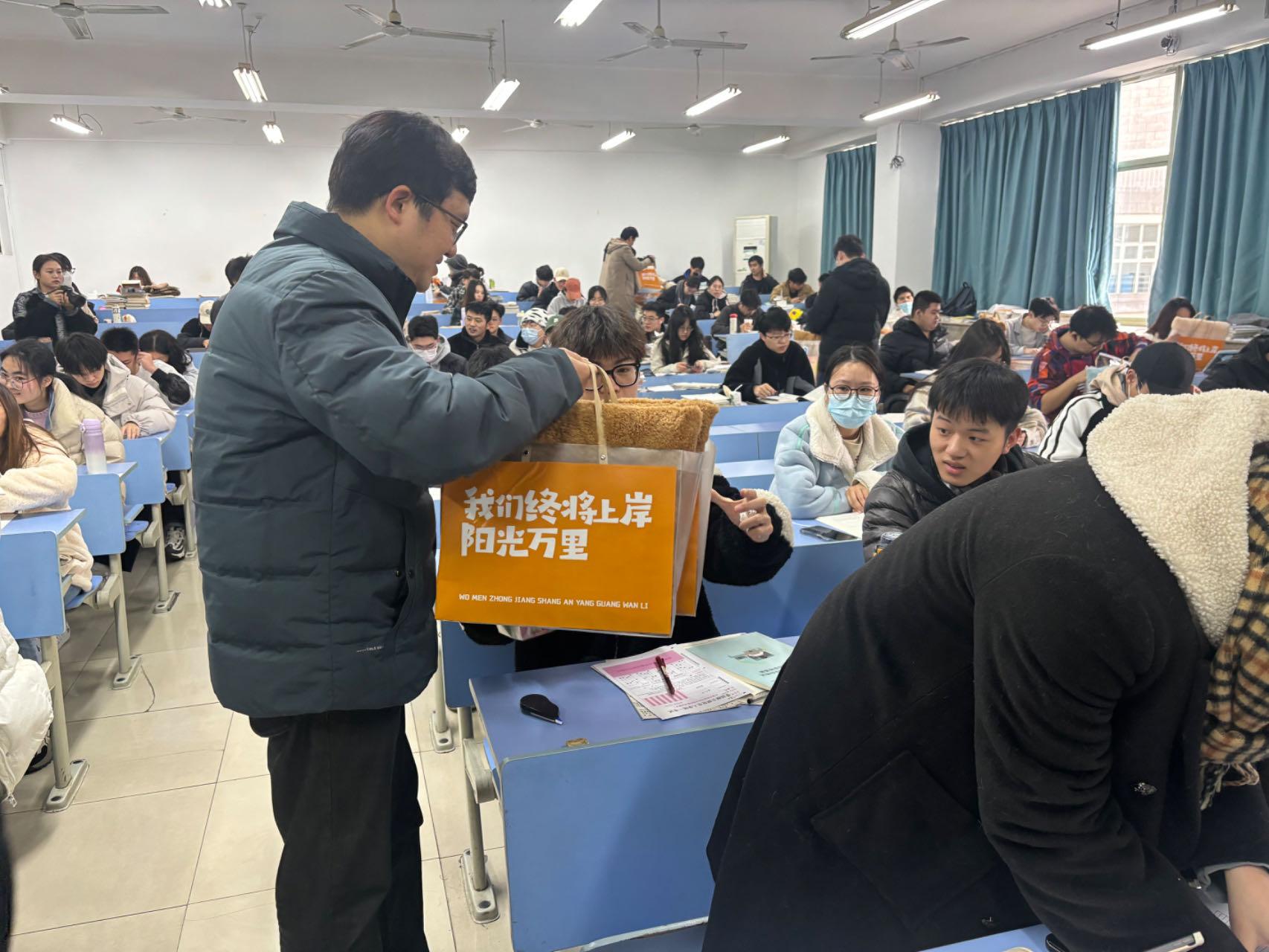 学子考研士气,坚定冲刺信心,传递冬日祝福,舒缓备考压力。12月13日上午信息管理与人工智能学院院长张帅、院党委书记徐奇伟、院党委副书记田聪、副院长隆清琦、院长助理陈明晶、党委委员章华、行政办主任徐吉锋及学院辅导员洪宝华、徐军军、马硕、吴泽勇、史光花老师一行前往考研教室,为即将踏上考场的学子送去鼓励和祝福。