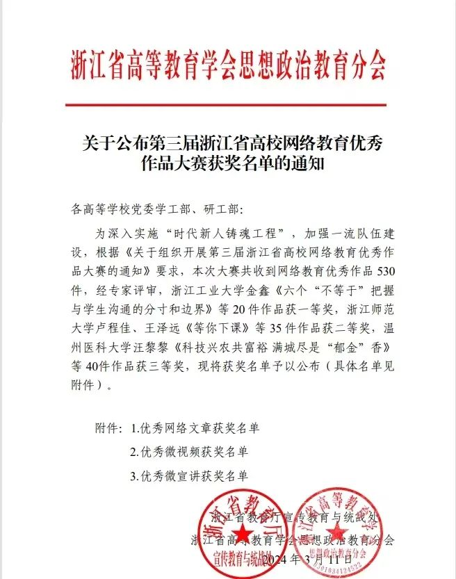 近日,由浙江省教育厅宣传教育处、浙江省高等教育学会思想政治教育研究分会组织开展的第三届浙江省高校网络教育优秀作品大赛获奖名单公布,巴卡漫画 思政辅导员赵梦瑶的作品《三张“网”托起共富“鱼”》荣获优秀微宣讲三等奖。