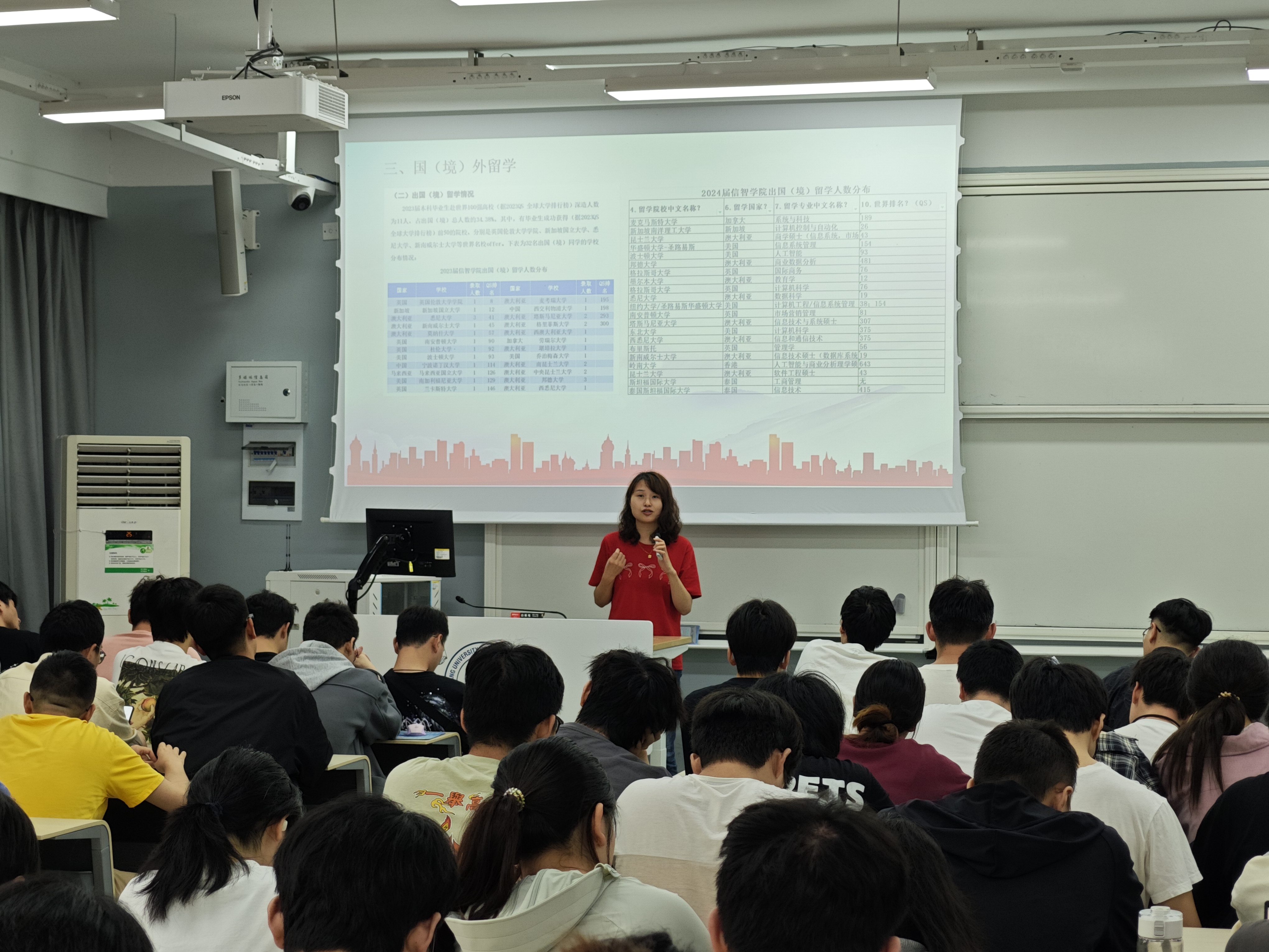 会上,朱凌老师详细介绍了考研形势,并对毕业生考研方向选择以及考研策略做出针对性指导。希望同学们能够做好考研复习计划,注重劳逸结合。吴轶韵老师以选择、心态、健康三个关键词为题,为毕业生提出宝贵建议。洪宝华老师分享了2023、2024年学院毕业生升学、就业情况,引导同学们尽早做好职业规划,明确职业方向。吴泽勇老师就毕业相关注意事项为同学们提供了丰富信息,助力学生顺利毕业。2024届升学优秀学生代表张有民、胡家赫分别从考研、出国层面分享了自己的实战经验,从学校选择、复习时间安排、学习方法、应试技巧等方面分享了心得体会。现场氛围融洽、干货满满,赢得了同学们的阵阵掌声。