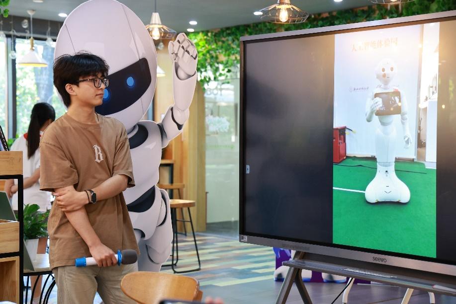 最后,Pepper机器人团队负责人王钰为学生们介绍了Pepper机器人。王钰从机器人动作设计、视频播放技术和语言交流能力三部分介绍了Pepper机器人的开发,加深了学生们对Pepper和人工智能在人机交互领域应用的理解。学生们认真听讲,积极互动,对Pepper机器人表现出浓厚兴趣。