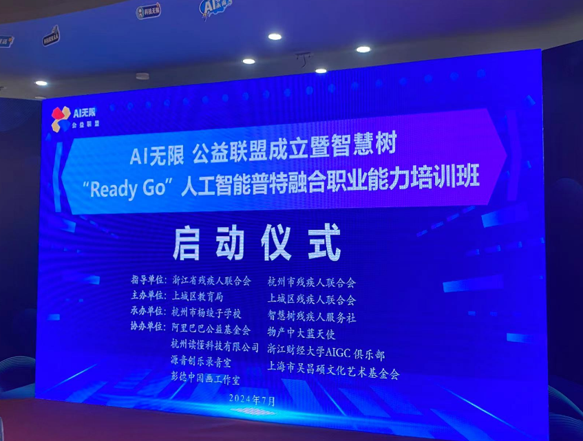 AIGC俱乐部积极与阿里巴巴公益基金会、物产中大集团“蓝天使”志愿服务队、杭州读懂科技有限公司、源音创乐录音室、上海市吴昌硕文化艺术基金会,以及彭德中国画工作室等多家单位,共同发起成立“AI无限公益联盟”,旨在通过AI相关培训,提升心智障碍儿童必要技能,使他们能自主生活并有尊严地融入社会。