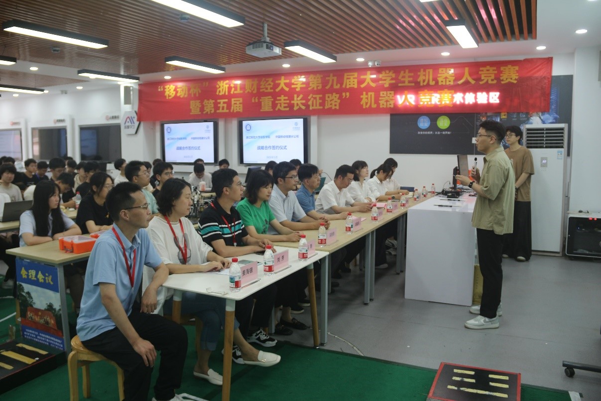 院长张帅详细介绍了“重走长征路”机器人竞赛的特色与意义。他指出,该项赛事已连续举办五届,既是学院品牌活动,也是学生实践创新的重要平台。本届竞赛得到中国移动钱塘分公司的大力支持,不仅为赛事注入资源,更通过校企联动为人工智能领域的人才培养开辟了新路径。