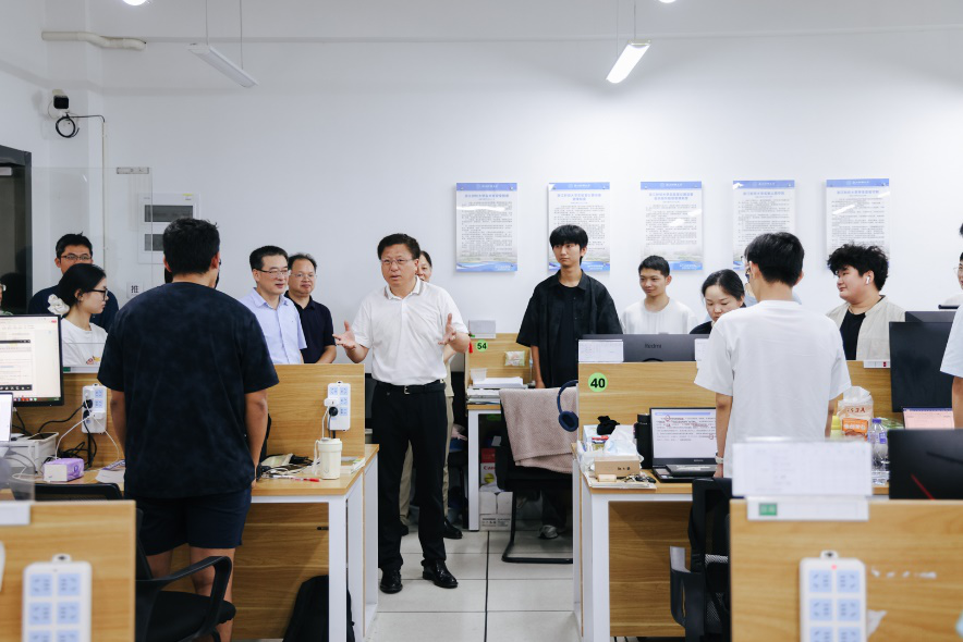 随后,魏江等一行来到研究生科研学习教室,同学们的掌声瞬间回荡在整个教室,现场气氛热烈而融洽。魏江看到研究生们认真投身于各类学术研究项目中,现场一片忙碌而充实的景象,他非常欣慰,勉励大家要保持对知识的渴望与敬畏之心,珍惜在校学习的每一刻,充分利用学校丰富的学术资源与优秀的师资力量,努力提升自己的专业素养与综合素质,以适应未来复杂多变的社会需求与行业发展趋势。他指出,信智学子肩负着特殊的时代使命与责任,一定要志向高远,不断深造学习,以创新的思维与扎实的专业知识,为推动人工智能技术在财经领域的应用与发展贡献智慧与力量,成为引领时代潮流的先锋力量,为学校争光添彩。