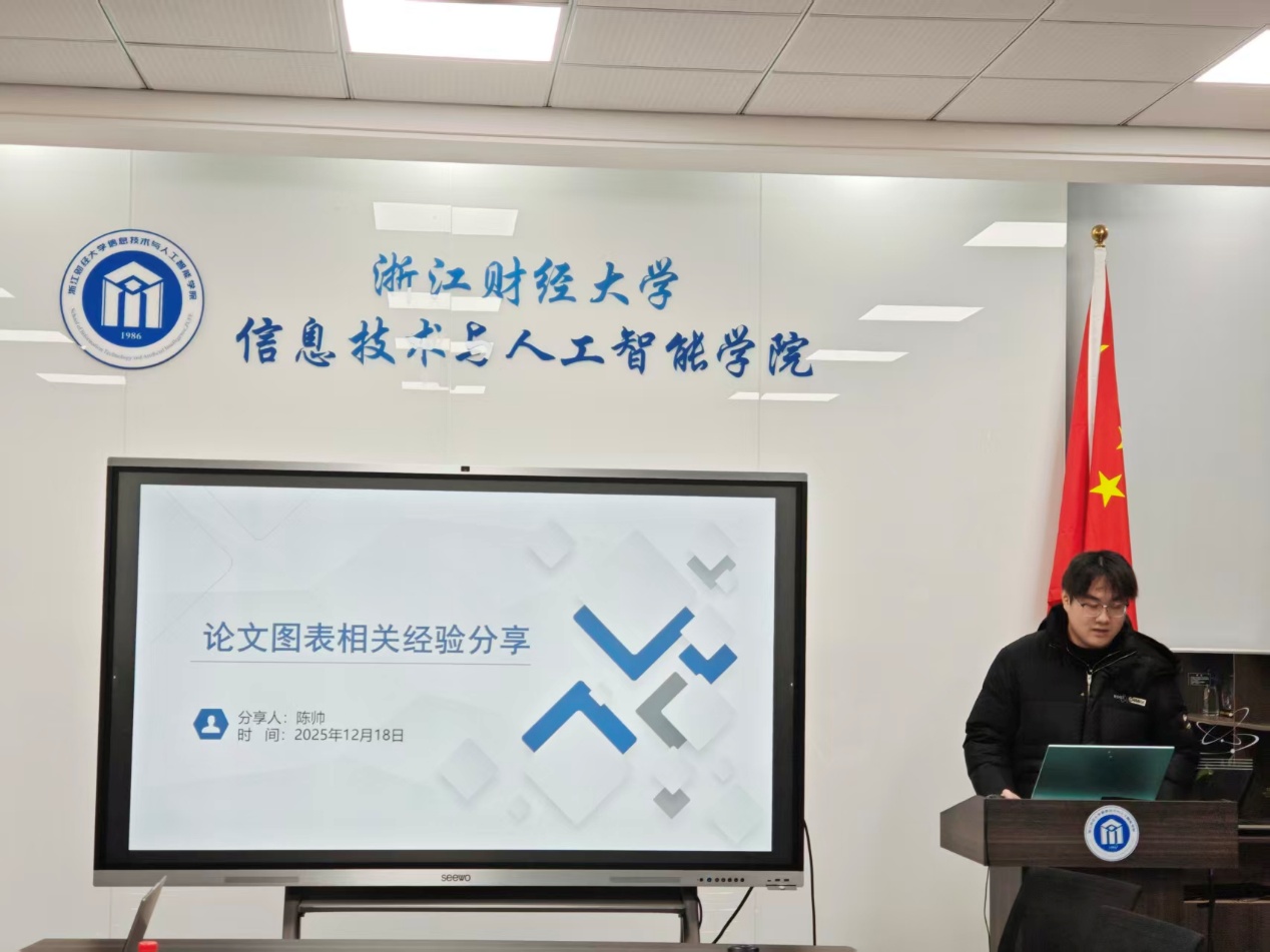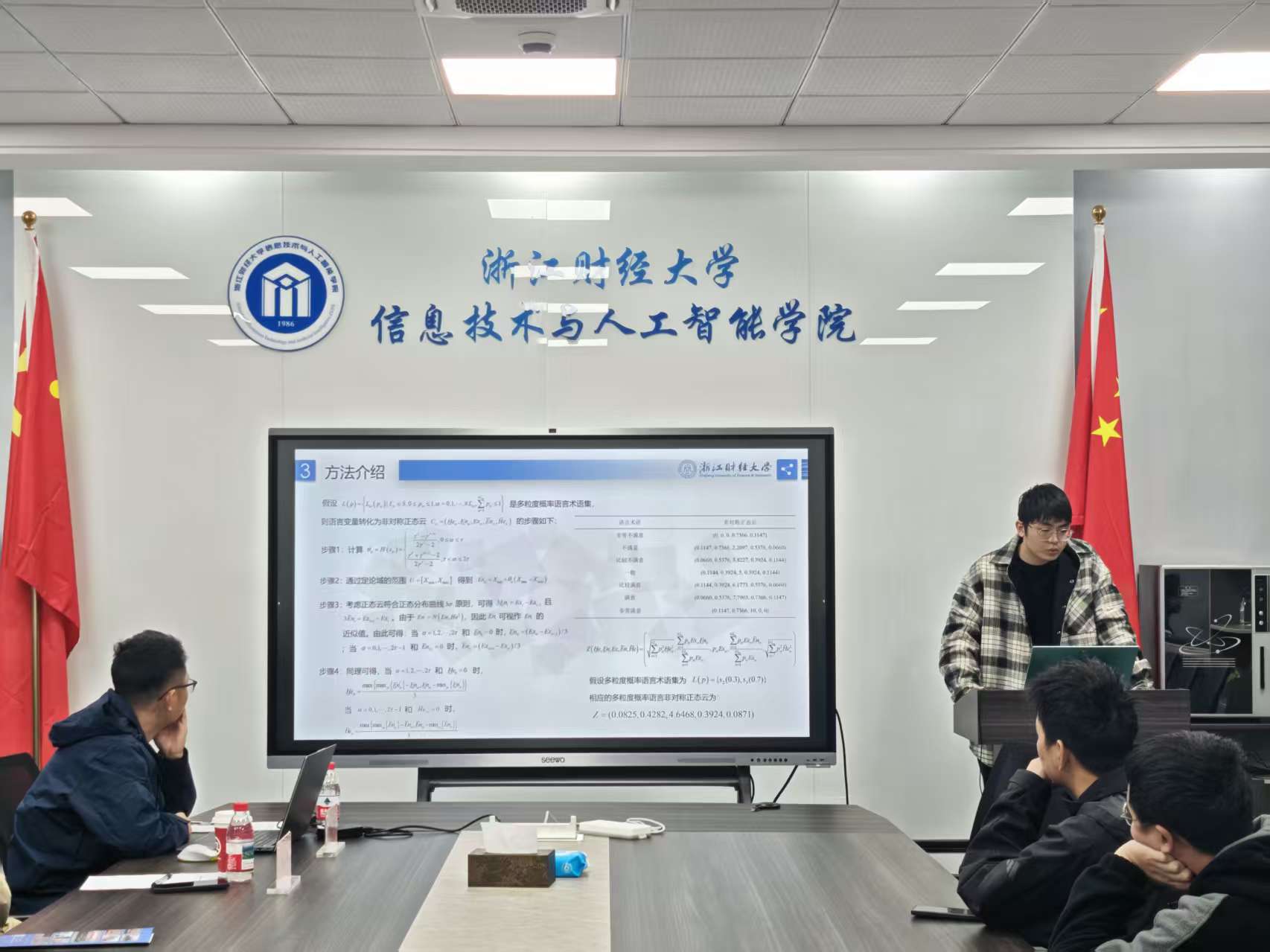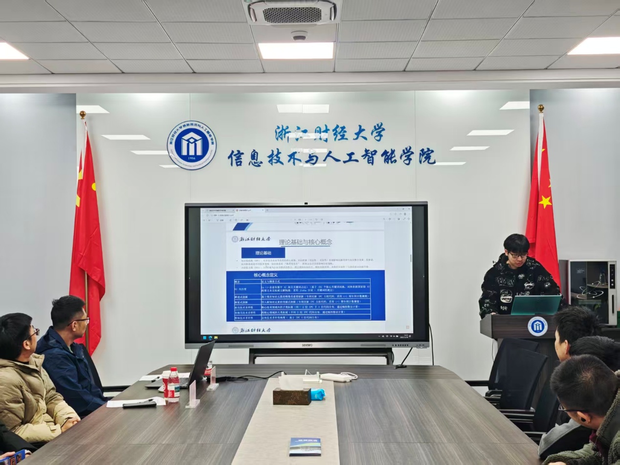 在9-404教室顺利举办了2025年第5期(总第28期)“数智钱潮”研究生论坛。本期论坛由学术部同学主持,邀请了涂乐博士、陈勇博士担任点评专家,吸引了众多研究生积极参与和热烈交流。论坛共有6名研究生进行学术汇报,内容涵盖论文图表经验分享、流水车间成组调度问题、扎根理论、在线协诊三边匹配决策方法、AI协助写作、技术多样性的调节效应研究等多个前沿研究方向。