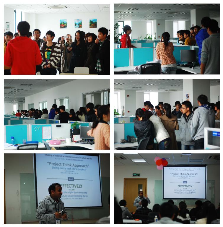 下午1:00,沈老师带领同学们参观了公司的工作场所-办公区、网络会议室和休息区。下午1:30,Infosys的印度工程师用英语为同学们做了一个名为“Project think approach”的主题报告。印度老师演讲幽默风趣,给同学们留下了深刻的印象。演讲过后是提问环节,同学们用英语向印度老师踊跃提问,双方进行了良好的互动。