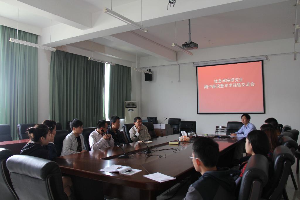 在9-404会议室举行了研究生期中座谈暨学术经验交流会。信息学院院长张文宇教授、副院长张帅副教授以及信息学院12级和13级研究生同学参加了本次座谈会。会上,两位导师首先了解了13级研究生选择导师的情况,以及入学以来的学习情况,并强调同学们要加强文献特别是英文文献的阅读,为发表高质量学术论文打下良好基础。随后,两位老师还详细介绍了学院对硕士生论文选题、开题报告以及小论文写作的要求,并向同学们通报了朱媛同学获得2013年研究生国家奖学金以及奚程瑜和朱媛同学的论文分别被SCI期刊和EI期刊录用的喜讯,同时勉励全体研究生同学以这两位同学为榜样,勤奋学习,勇攀科学高峰,争取早日产出高质量的科研成果。接下来,12级研究生朱媛同学从自身角度出发与同学们分享了自己入学以来在文献阅读和论文写作方面的体会和经验。最后,两位老师回答了同学们在课程学习、论文选题、文献阅读、期刊投稿、奖学金评比等方面的提问,并与同学们进行了深入交流。
