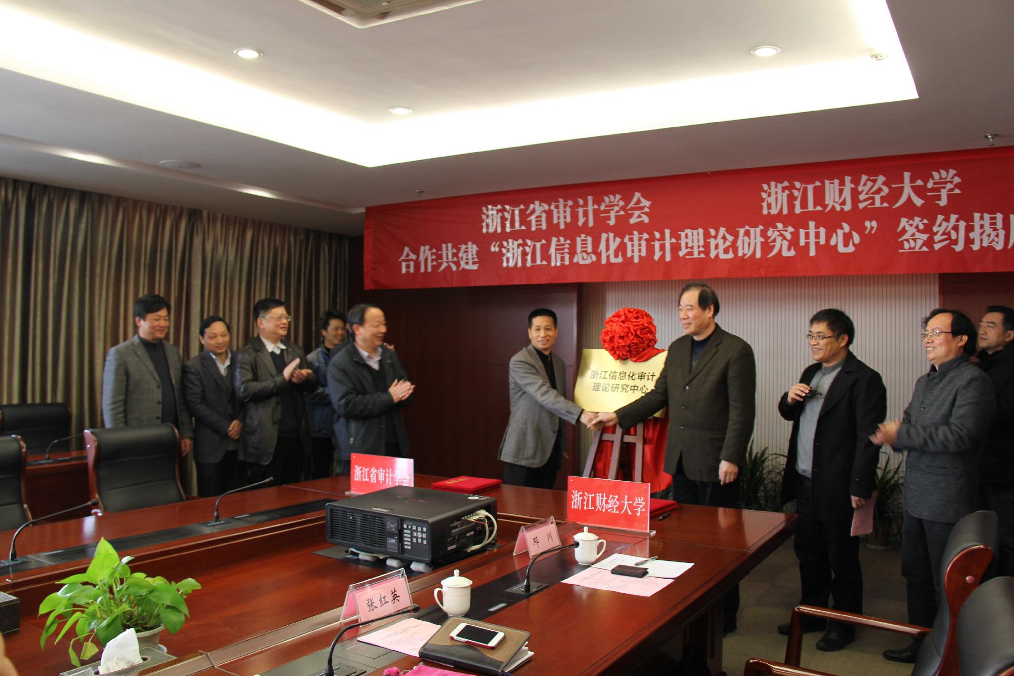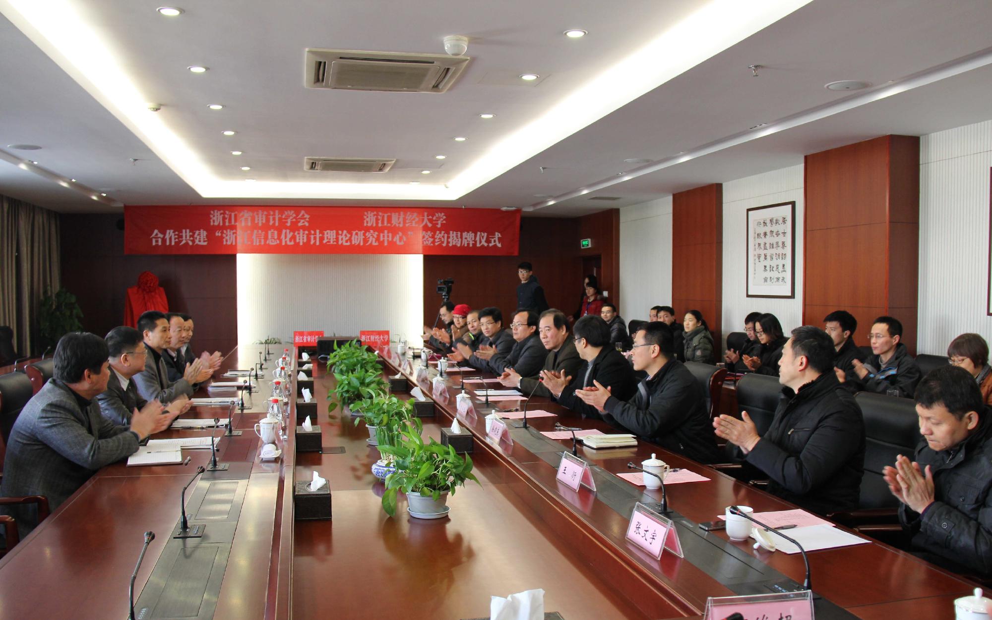 12月30日上午,“浙江信息化审计理论研究中心”签约暨揭牌仪式在我校行政楼会议室举行。浙江省审计厅副厅长王小龙、总审计师金建培、经济责任审计处三处处长姜英杰、审计中心主任周仲利、审计科研所所长甘伟军,校长王俊豪、副校长苏为华、副校长黄建新出席仪式,党校办、科研处、计财处、信息学院、会计学院的负责人和教师代表共计30余人参加仪式。