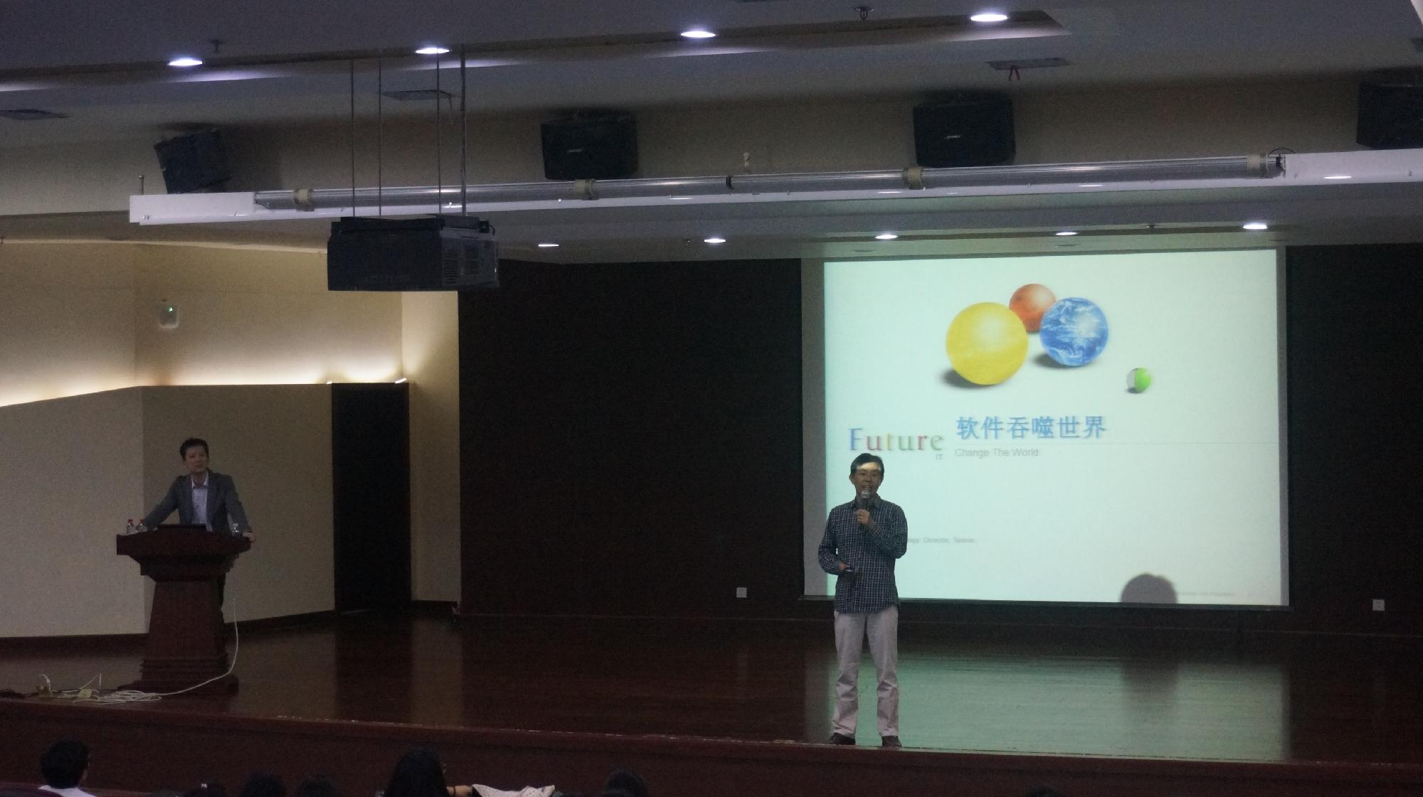 2014年10月28日下午13点30分,由达内集团周羽老师主讲的《软件吞噬世界》主题讲座在学术中心1号报告厅隆重举行,信息学院领导何维超、张帅老师及信息学院全体大一大二学生参加了本次讲座。