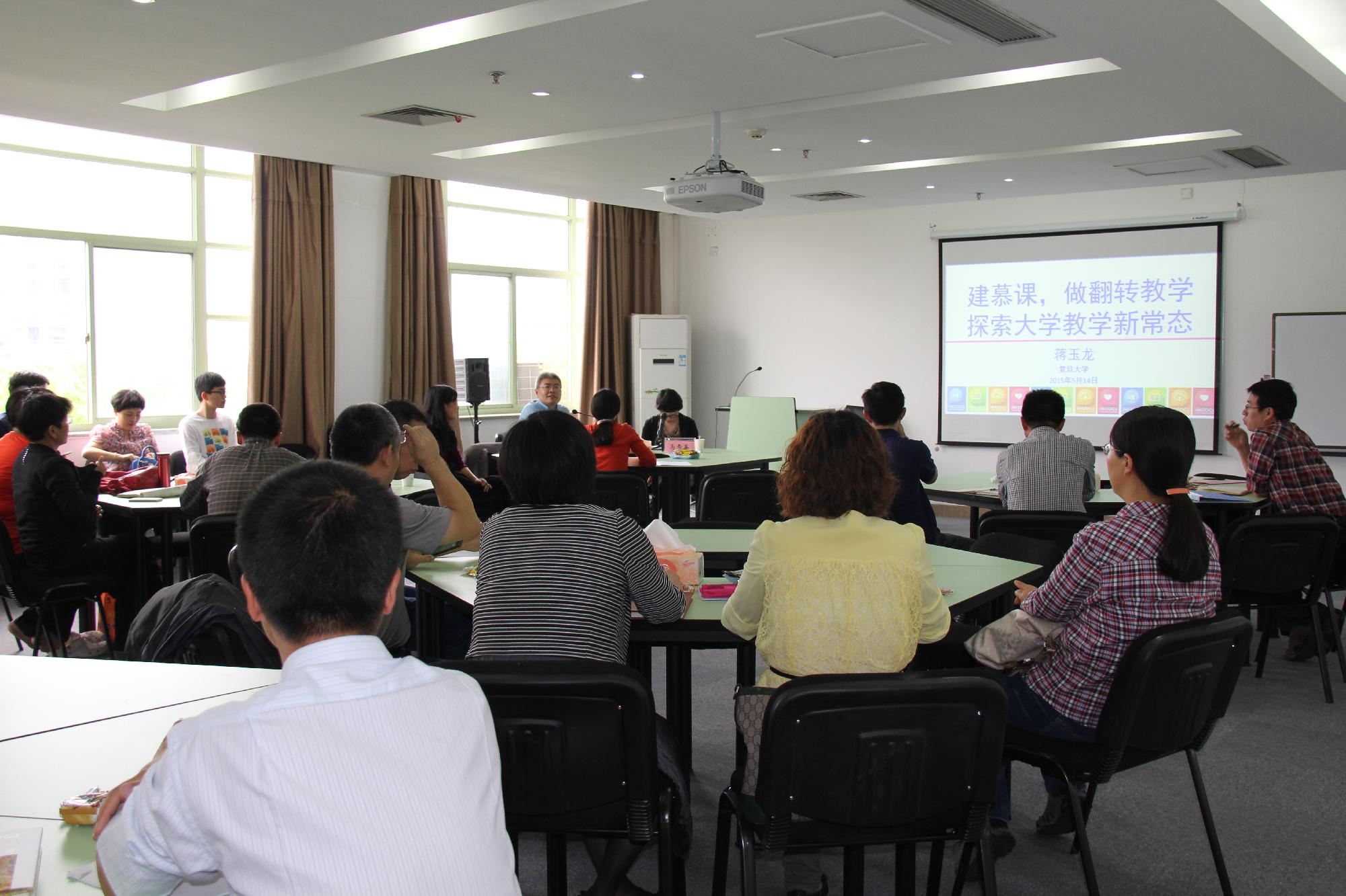 讲座围绕为何要建设MOOC、如何建设MOOC、如何翻转课堂三个主要主题,深入浅出地展开,引起了在座老师们的极大关注;接着蒋教授结合自身建设MOOC、基于MOOC实现课堂教学翻转的实践过程,非常真诚地分享了课堂教学改革的经验、体会和反思,激起了老师们关注MOOC建设实施课堂翻转的热情,老师们纷纷结合自身教学课程的实际,提出操作层面的问题,蒋教授一一进行解答。