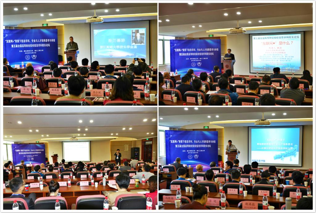 10月30日上午,由我校信息学院与浙江工商大学计算机与信息工程学院联合举办的第五届全国高等财经院校信息学院院长论坛在我校9-302报告厅隆重举行。校长李金昌教授和江西财经大学信息管理学院前院长万常选教授分别致开幕辞,来自27所财经院校信息学科的60多位领导和专家们汇聚一堂,围绕着“互联网+背景下信息学科、专业与人才培养思考与举措”这一主题,一起思考、探讨和解决高等财经院校信息学科发展面临的共同困惑和共性难题。