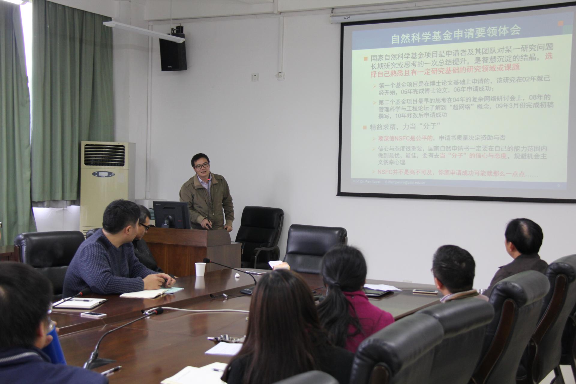 教师对国家自然科学基金项目申报的热情,提高科研项目申报的命中率,学院于11月10日下午14:00在学院楼404会议室举行了2017年国家自然科学基金申报动员、辅导会。浙江理工大学经济管理学院副院长潘旭伟教授应邀以“自然科学基金项目申请体会与提纲解析”为主题分享了国家自然科学基金的申报经验。学院及兄弟学院约20名科研骨干教师参加了本次动员、辅导会。