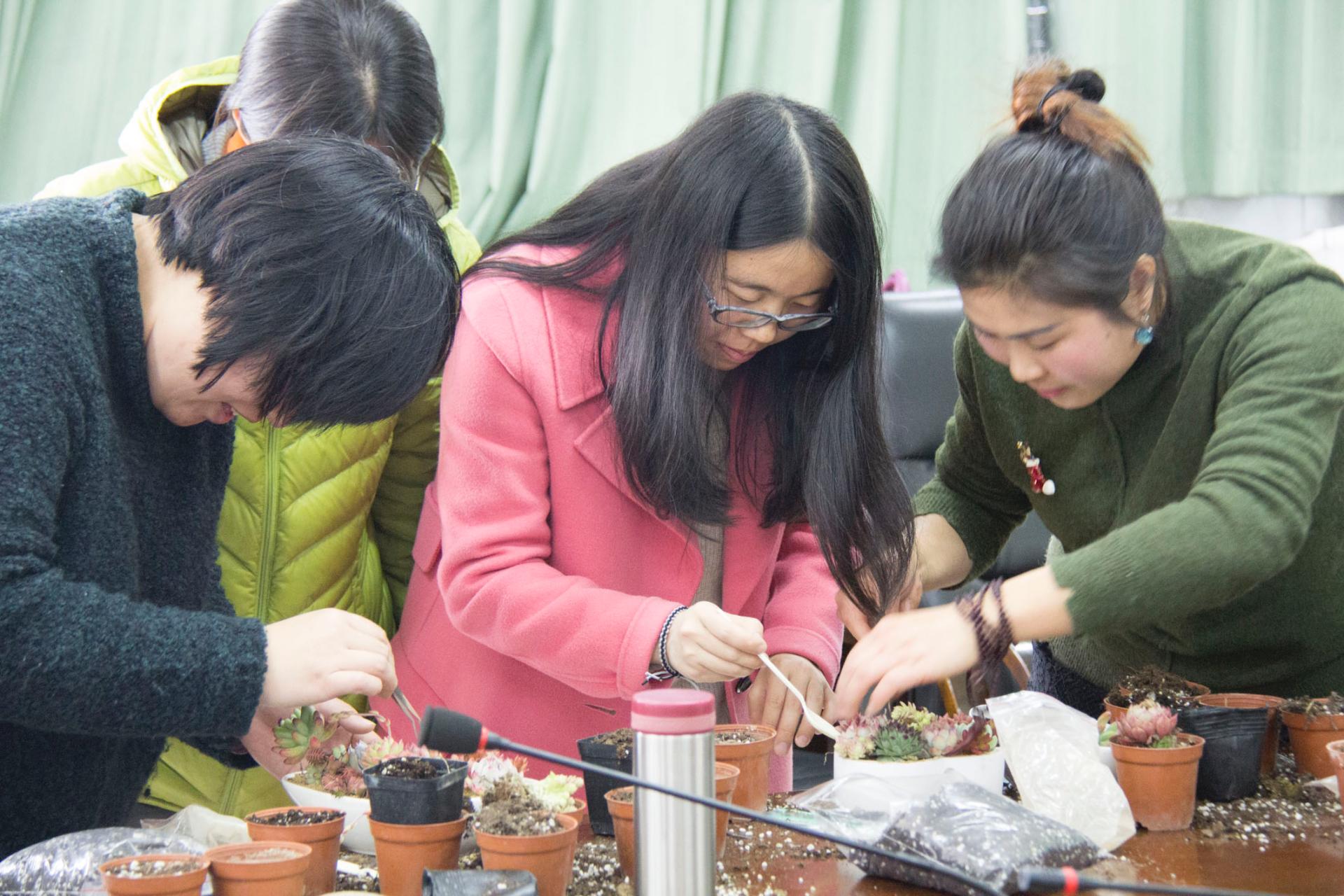 3月16日的下午,女神们热情洋溢的汇聚在9-404会议室,聆听了园艺老师从名称、养护、种植方法等各方面详细讲解后,在既有材料的基础上,发挥自己的想象力,搭配出形态各异,风格不同的小盆景,通过自己的创意使肉肉植物更加活泼生动。老师们围绕在一起,专注于栽培植物,或相互交流,或互相帮助,一片欢声笑语,在愉快轻松温馨的氛围中共同分享节日的快乐.