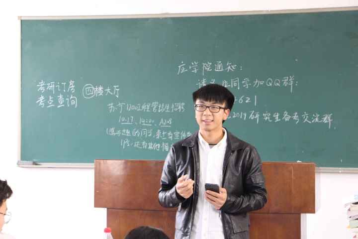 张帅老师在交流会上为大家分析了近几年考研的热度和难度,从三个方面为备考的同学给出了指导性的建议。针对往年毕业生考研扎堆热门学校的现象,张帅老师建议大家要根据自己的复习状况有个合理的定位,避免眼高手低。面对初试,张帅老师建议大家调整好心态,合理安排好各门课的复习时间,在保证数学和英语复习充分的基础上,要在专业课复习上下功夫,特别是跨学科考研的同学,要争取在专业课方面获得较高成绩,这样在复试时才会有较大的竞争力。在备考的道路上,张帅老师建议大家可以为自己做个规划,在达成最终目标前可以设立多个短期目标,循序渐进、脚踏实地完成自己的学习。学院在读研究生陈勇、杨栋齐也为备考的同学带来了干货,从备考的时间安排、心态调整、复习重点转移等细节方面分享了很多的经验,特别对于准备英语、政治两门课程的复习介绍了很好地学习方法。