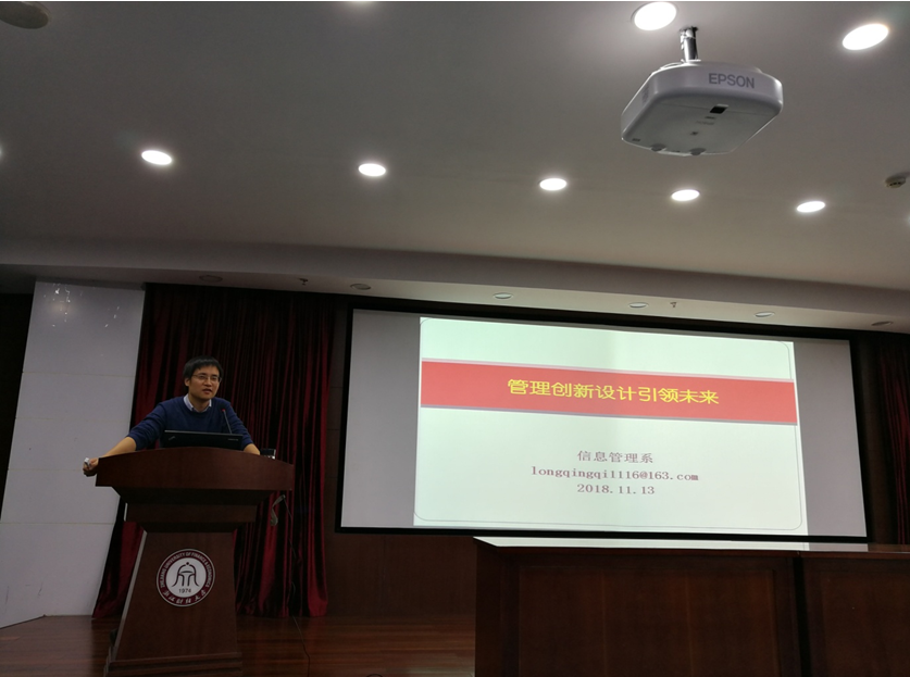 为提升学生对管理创新设计及其重要性的理解和深化对信息管理专业的认知度,使学生明悉专业分流的理性、合理、有效选择,2018年11月13日下午14:00,信息管理系(教工第一党支部)在学术中心第四报告厅举行了以“管理创新设计引领未来”为主题的专题讲座。本次讲座由隆清琦老师主讲,到场嘉宾有学院院长张文宇教授、教工第一党支部书记朱凌老师、实验中心主任章华老师和彭娟娟老师。