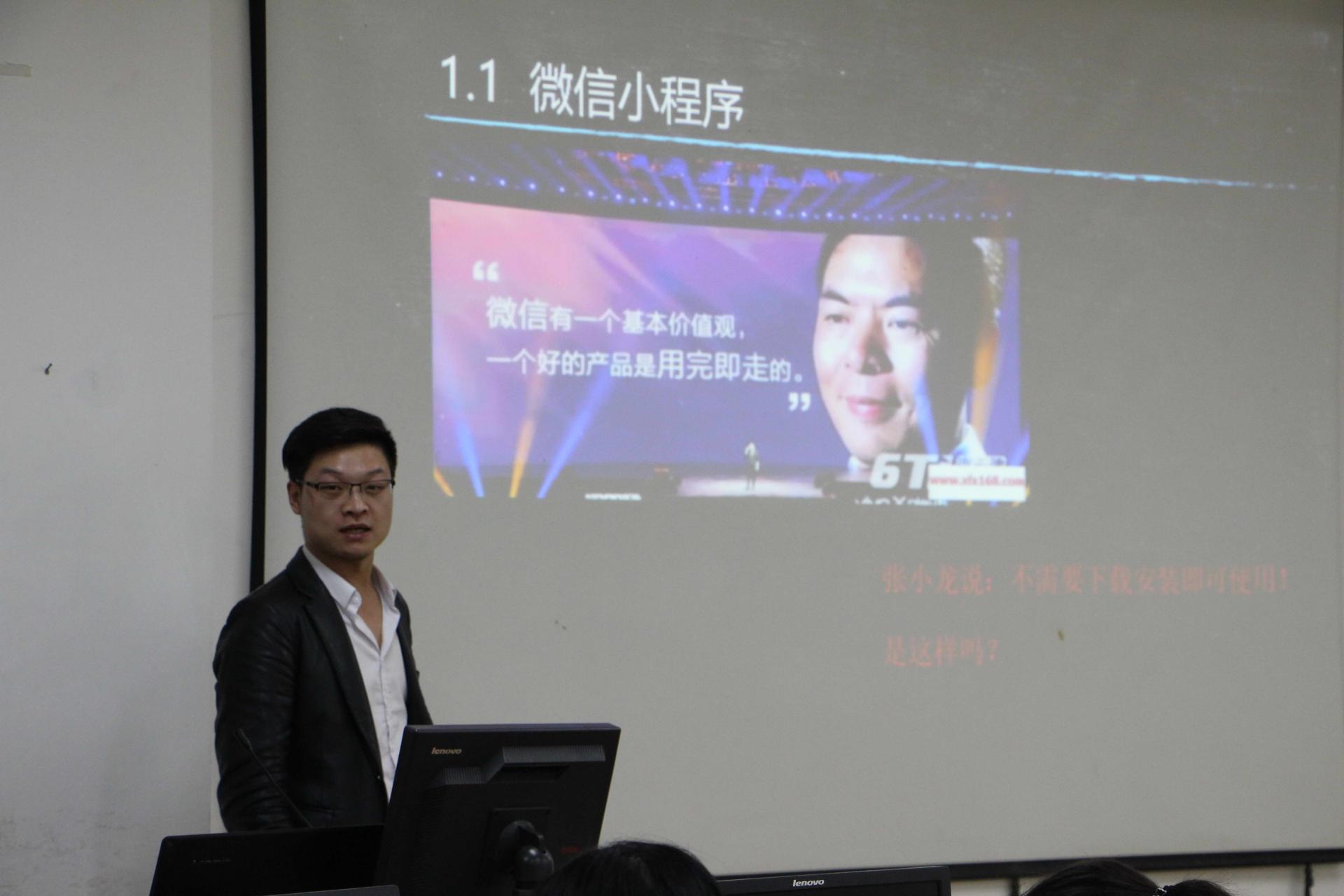 杨老师首先详细介绍了微信小程序在现代移动社交中的优势。相比APP体积大、下载速度慢的缺点,微信小程序体积小,下载及清除都极快,能起到“用完即走”的效果。接下来,杨老师讲授了小程序开发项目的主要功能,并在大屏幕上进行小程序开发的实例演示,每个细节都仔细分析,并手把手地将教给同学们。