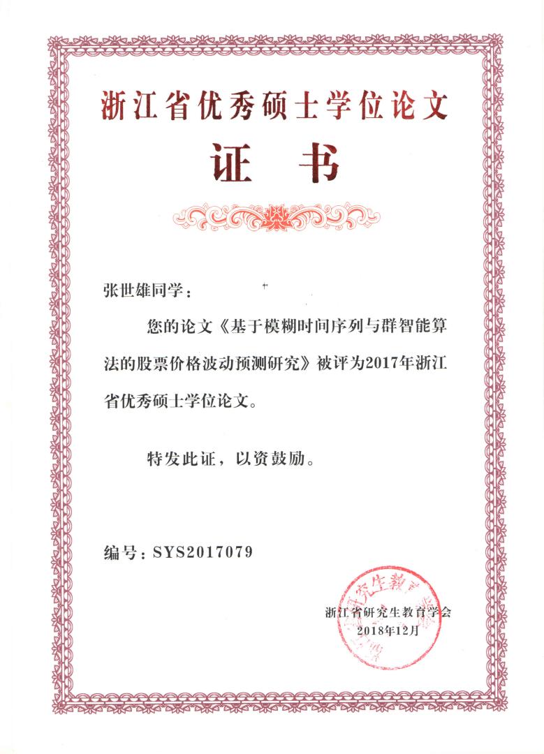 管理统计学专业2014级硕士毕业生张世雄的硕士学位论文《基于模糊时间序列与群智能算法的股票价格波动预测研究》被评为2017年浙江省优秀硕士学位论文。此次评选共评出21篇优秀博士学位论文,94篇优秀硕士学位论文,我校共有3篇硕士学位论文入选。这是继2016年巴卡漫画