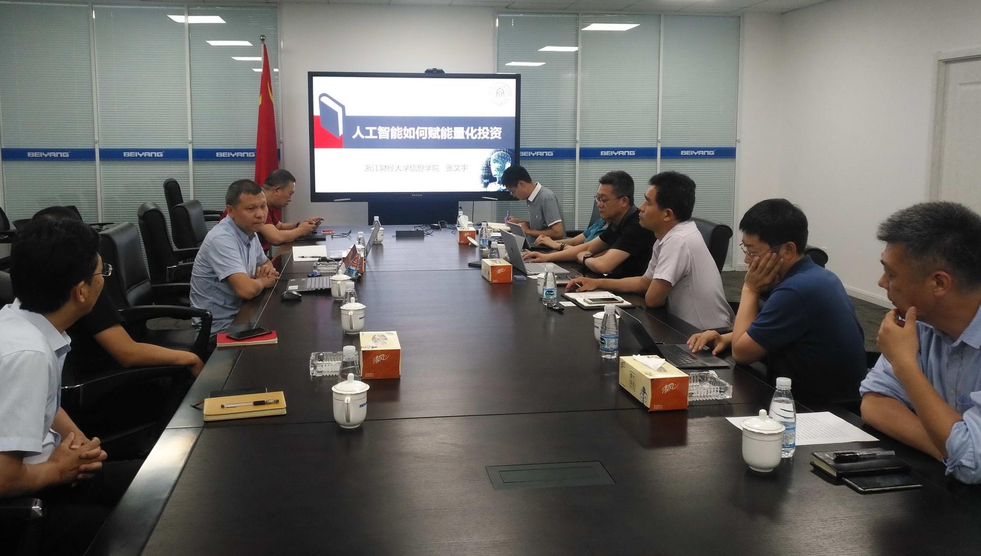 报告会后,张文宇、张帅教授与北洋电气集团领导和技术骨干就人工智能、智能量化投资等主题进行了深入交流和讨论,并就后续的技术研究和项目合作进行了初步磋商。