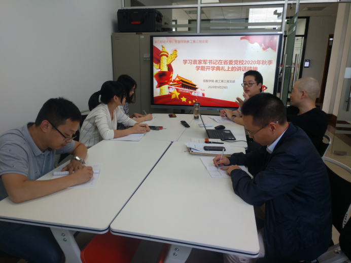 2020年9月29日,信息管理与人工智能学院教工第三党支部在9301D召开主题学习会,学习省委书记袁家军在省委党校2020年秋季学期开学典礼上的讲话精神,会议由支部书记杨水清主持,支部成员参加。