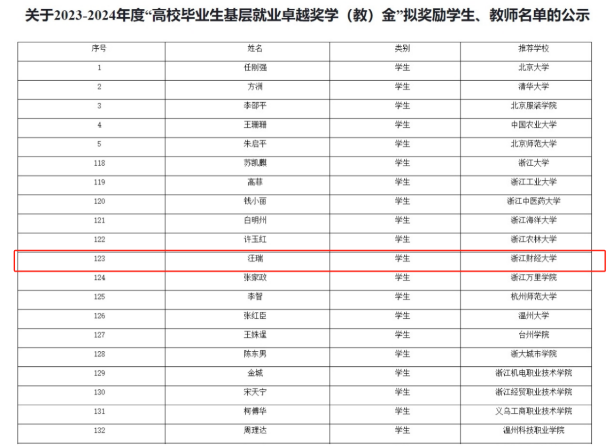 近日,中国教育发展基金会公布2023-2024年度“全国高校毕业生基层就业卓越奖学(教)金”获奖名单,我院2015届毕业生汪瑞荣获“全国高校毕业生基层就业卓越奖”。本次全国共评选398名毕业生,其中,浙江省15名毕业生获评(我校1名)。