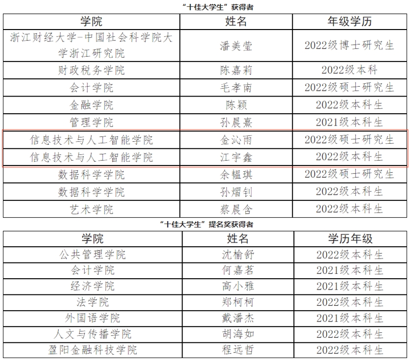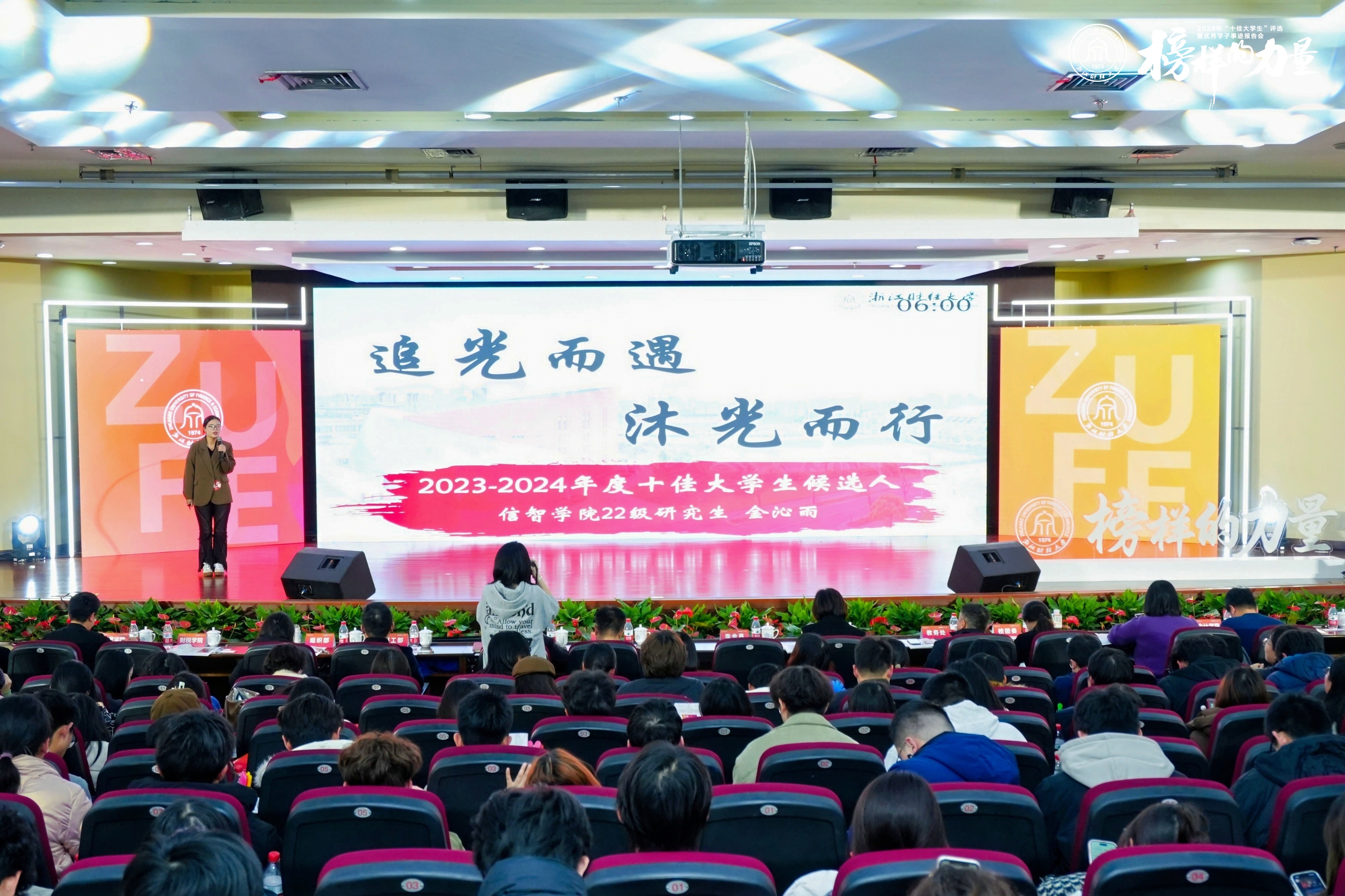 学子经过组织推荐和现场展示评选,凭借德智体美劳各方面的优秀表现以及在学术研究、学科竞赛、社会实践、志愿公益等领域的突出成果,经过激烈的角逐,在全校众多优秀学生中脱颖而出。2022级管理科学与工程专业硕士研究生金沁雨、2022级人工智能专业本科生江宇鑫同时获评校“十佳大学生”,展现了信智学子昂扬向上的精神风貌、踏实进取的优良学风,发挥了积极的榜样作用。