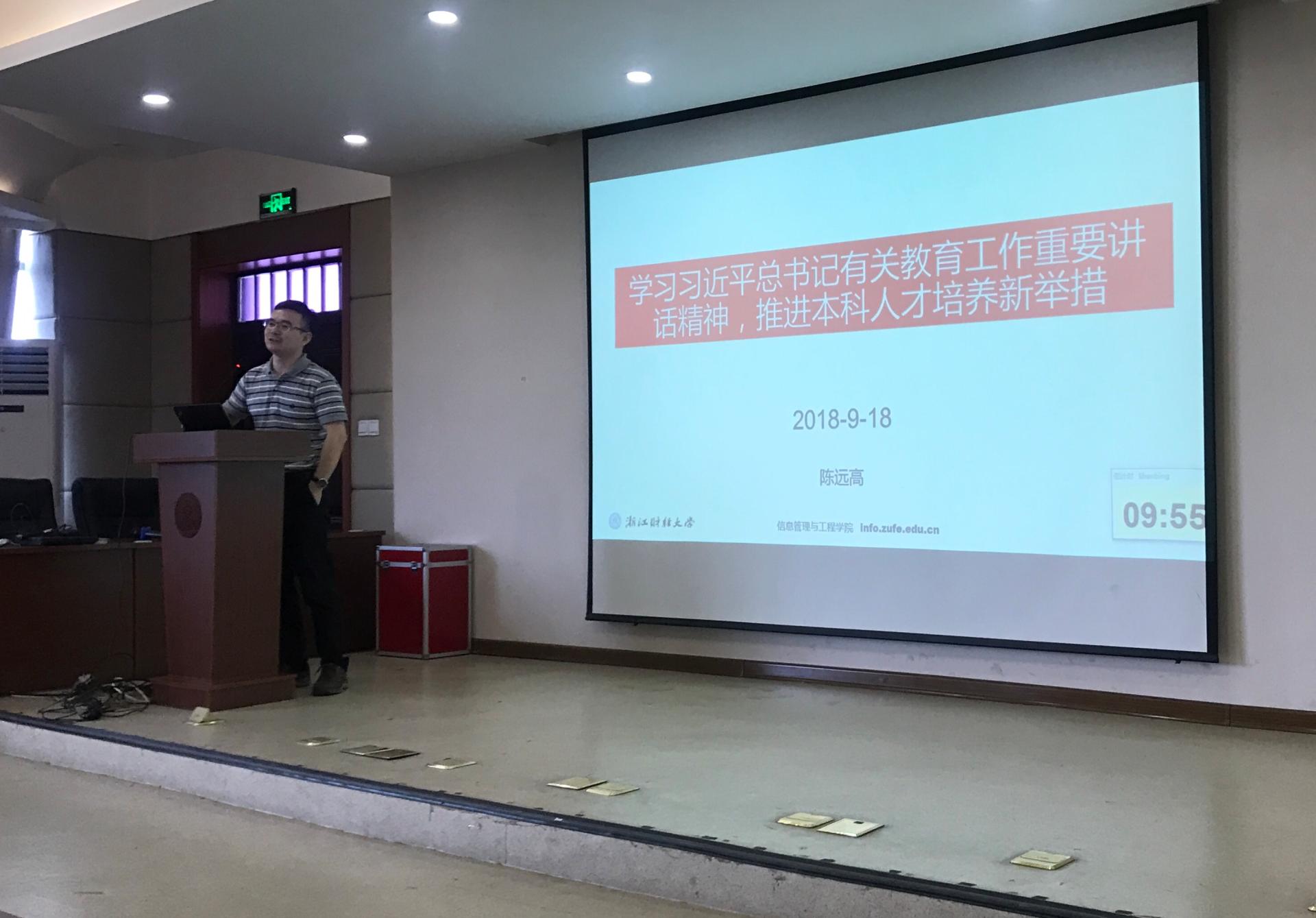 首先,陈远高老师传达了习近平总书记在北京大学师生座谈会上讲话和全国教育大会精神。习近平总书记在2018年5月2日,在北京大学师生座谈会上说大学是立德树人、培养人才的地方,是青年人学习知识、增长才干、放飞梦想的地方。习近平总书记在2018年9月10日,在全国教育大会上首次提出教育是国之大计、党之大计。