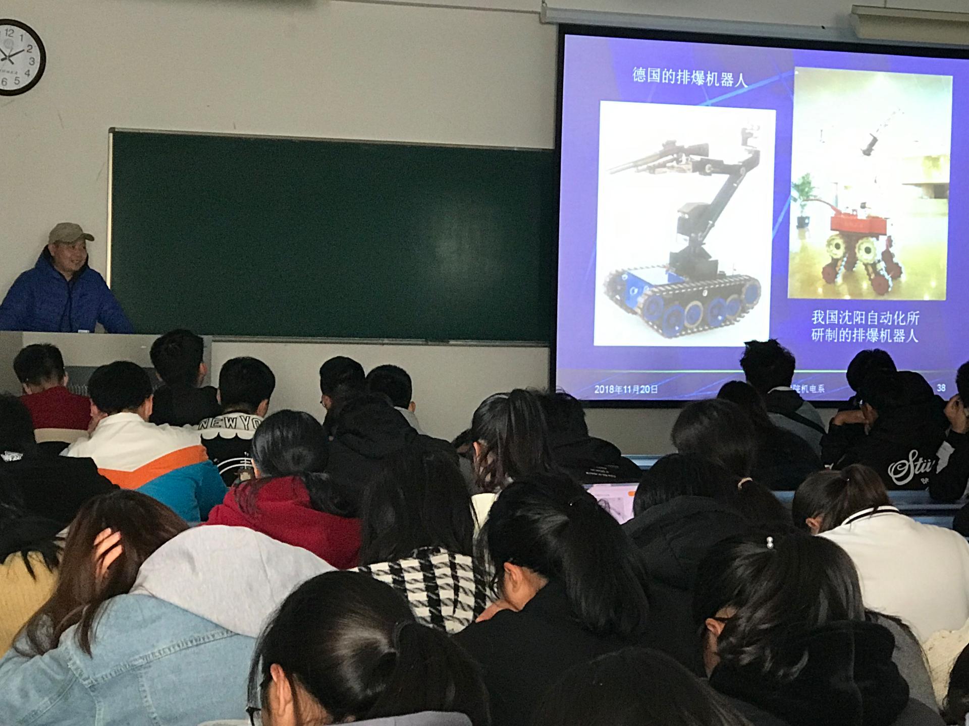 随后,潘博士生动地向同学们介绍了机器人技术和人工智能的专业基础知识,让同学们对这两项技术有了初步认知。之后,他向同学们讲述机器人技术和人工智能与我们日常生活的紧密联系,介绍了这两项技术未来的就业发展前景。为了让同学们对两项技术有更直观明确的认识,潘博士向在座同学们展示了许多科技成品图片。这些成品有工业上使用的工业机器人,有深海探测的海洋机器人和外太空探测的机器人,以及军事上提供后勤服务的专用机器人等等。通过潘博士的介绍,同学们可以看到生活的方方面面都有着机器人技术的身影。