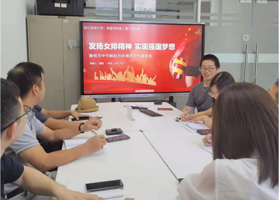 东京奥运会中国女排出局,但女排精神永不磨灭。2021年8月31日,信息管理与人工智能学院教工第三党支部在9301D开展“发扬女排精神,实现强国梦想”主题党日活动,会议由杨水清主持,姜辉做主题报告,支部党员参加。