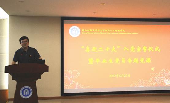 宣誓仪式后,学院党委书记徐奇伟为毕业生讲授专题党课。他代表学院党委对全体毕业生党员取得的优异成绩表示祝贺,对大家在理想信念方面的进步表示肯定,对大家四年以来对学院党委工作的支持表示感谢。衷心祝愿大家在未来的人生道路上取得优异的成绩。徐奇伟指出,本次毕业生党员教育会议是一次党课也是一次交流心得的会议。是学院党委向即将开启全新组织生活的同学们的教育大会。他希望大家爱校荣校,把“进德修业与时偕行”的优良校风发扬光大;铭记党员身份,把党员优良传统薪火相传;增强纪律意识,自觉遵守规矩,做到心有所戒,行有所止,砥砺品行;争做社会主义建设者和接班人,在实现第二个百年目标的新征程、新起点上持续奋斗,爱国担当,为母校争光,为党添彩。