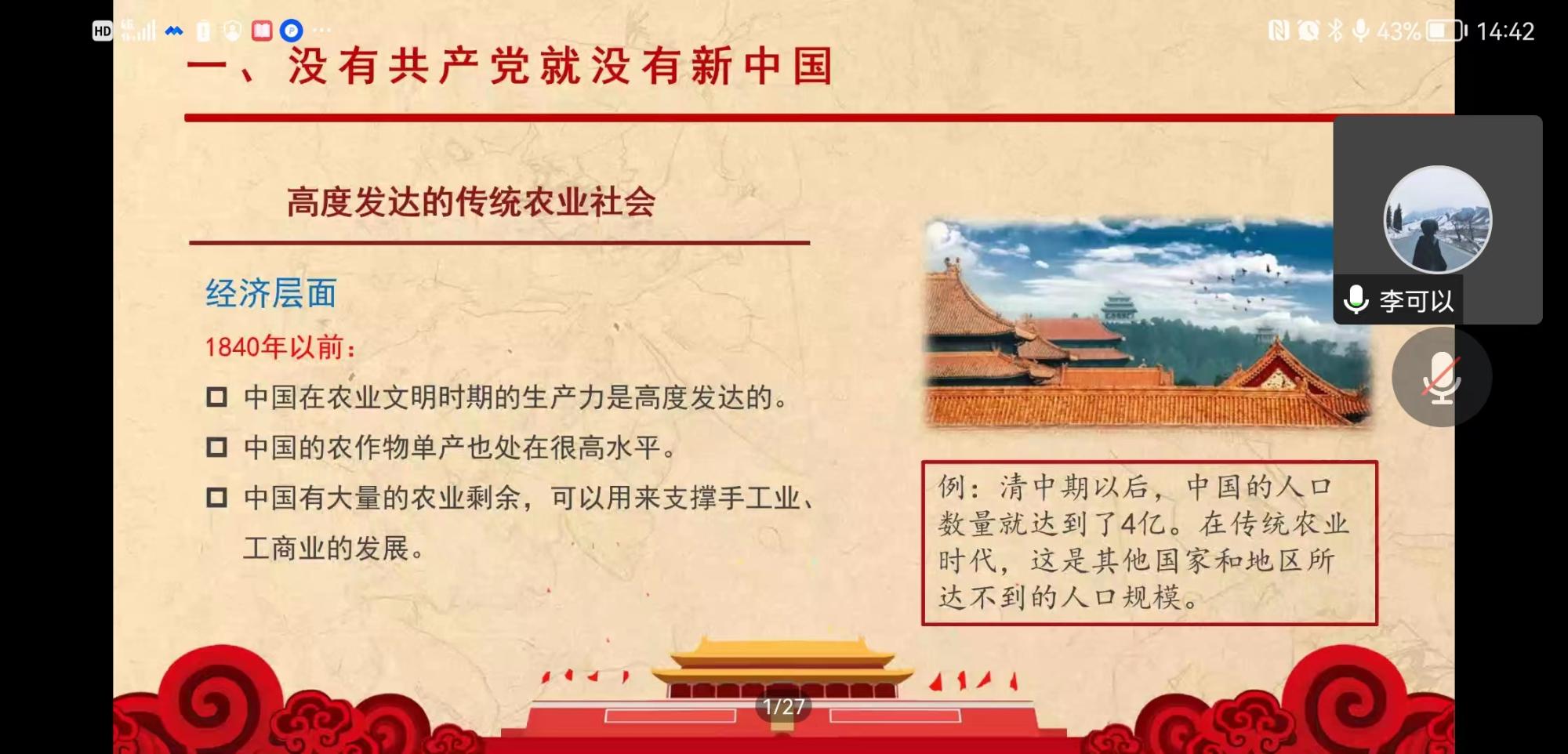 学生第一党支部书记马硕为同学们分享了党近百年艰辛的奋斗历史,以各届全国代表大会的开展为主线,展现了党在新民主主义革命时期、社会主义革命和建设时期、改革开放和社会主义现代化建设时期积累的丰富的经验以及经受挫折的教训,继承治党治国的宝贵精神财富。