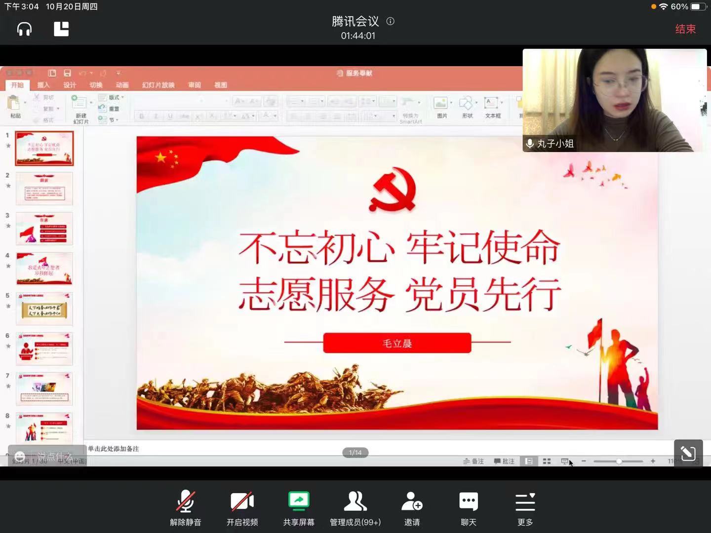 学生第三党支部书记毛立晨以“跟总书记学坚定理想信念”为主题,通过总书记七年知青岁月的一则则小故事,十八大以来重要会议解读,鼓励同学们把伟大建党精神内化为坚定不移的理想信念,不断筑牢信仰之基,补足精神之钙,坚守人民立场、厚植为民情怀,在担当中历练,在尽责中成长,把人生理想融入国家和民族的事业中,勇敢地担当起“请党放心、强国有我”的神圣使命。