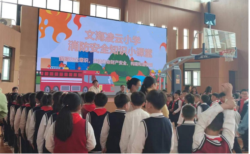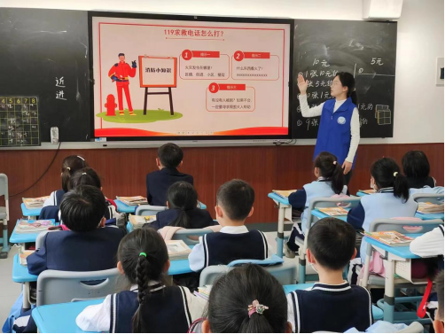 另一队同学前往体育馆带领3-4年级小学生们进行现场实训活动。首先在体育馆进行消防知识的讲解,介绍火灾的危害、火警的正确拨打等知识,然后与小朋友们积极互动,小朋友们深入了解到消防知识,正确回答了有关消防知识的问题。