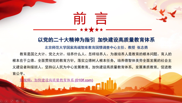 教师们共同学习了北京师范大学国家高端智库教育国情调查中心的张志勇教授的“以党的二十大精神为指引,加快建设高质量教育体系”的专题大讲堂。主要学习了加快建设高质量教育体系的时代背景、战略地位、本质特征和根本要求。