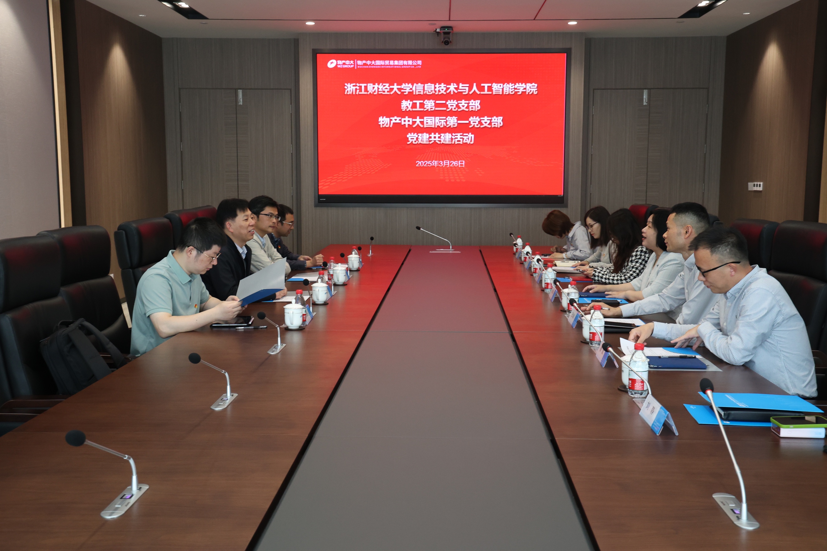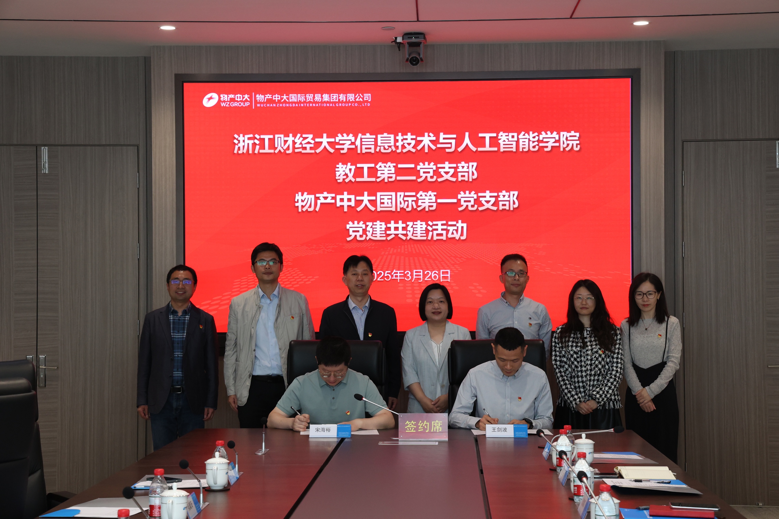 教工第二党支部与物产中大国际贸易集团有限公司第一党支部开展党建共建活动。学院院长张帅、党委书记吴翼泽率队赴物产中大国际交流,双方签订支部共建协议。物产中大国际党委副书记、副董事长、纪委书记、工会主席葛军燕,学院教工第二党支部书记宋海裕、人工智能系主任陈琰宏,物产中大国际第一党支部书记、首席专业技术经理、运营管理中心总监王剑波,物产中大国际党群部、纪检室、工会办公室主任张蔻蔻,数字科技部总监曹斌等有关人员参加了活动。