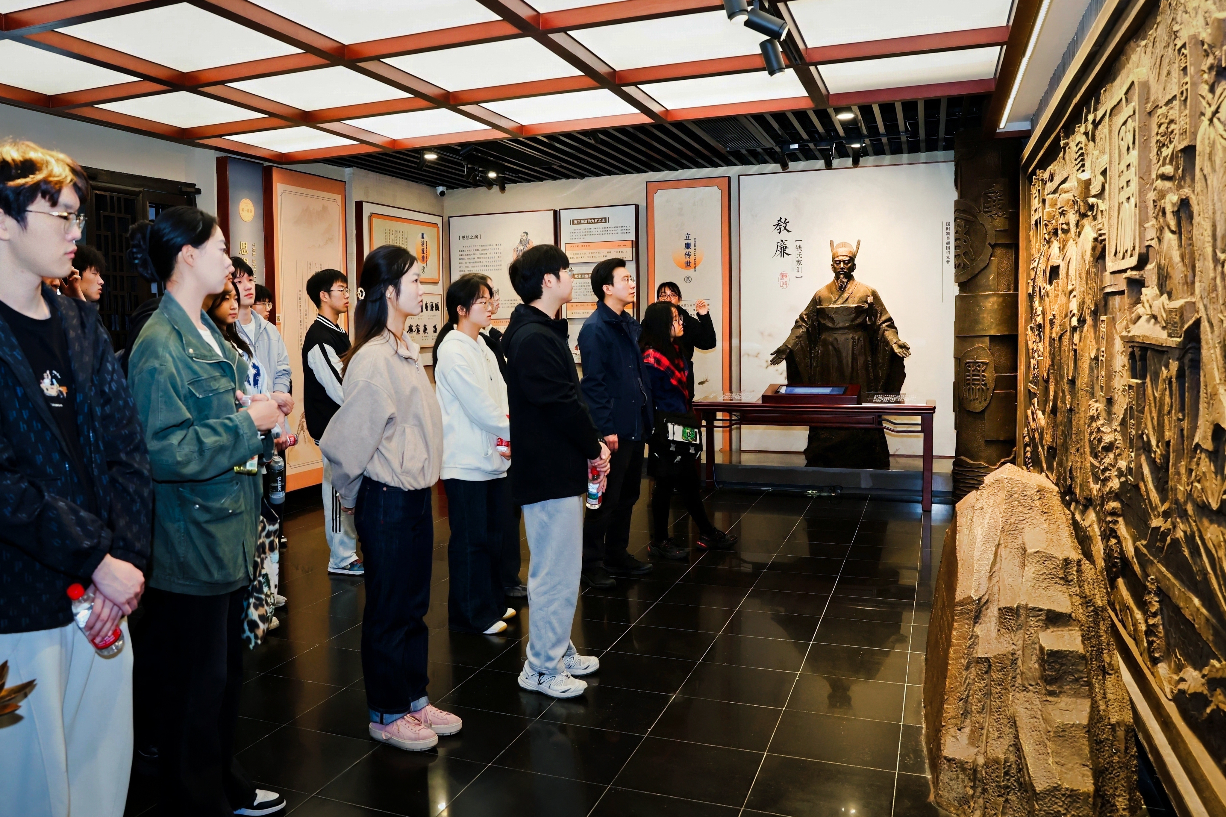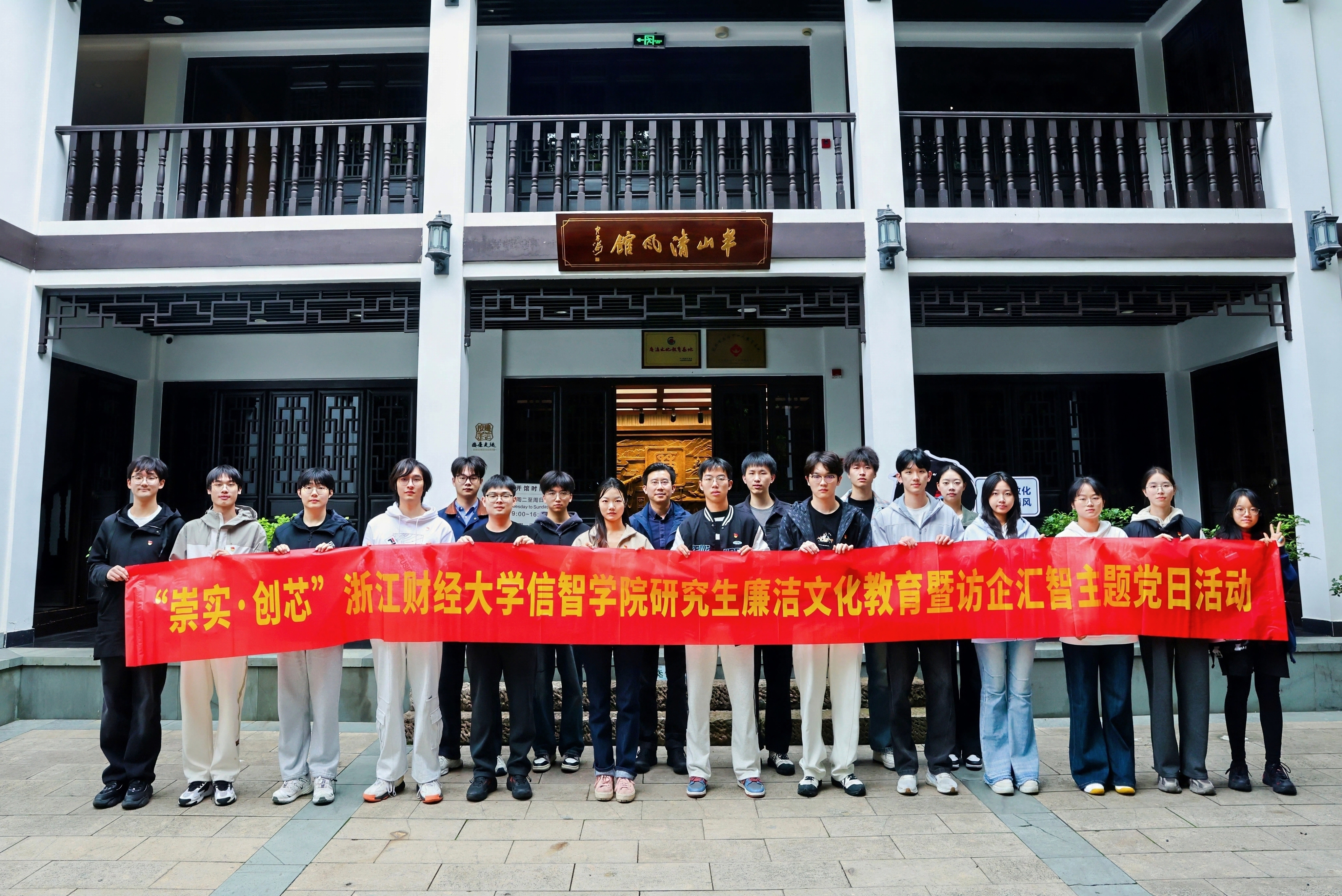 活动首站,学院研究生党员与本科生代表一同走进杭州市拱墅区半山清风馆。在讲解员的引导下,通过丰富的图文、实物与多媒体展示,系统学习了中国古代廉政思想的发展脉络与监察制度的演变历程。从历史先贤的廉洁风范到新时代全面从严治党取得的卓越成就,浓厚的廉洁文化氛围使同学们深刻体悟到“廉”字承载的千钧分量。大家纷纷表示,要以此次学习为契机,自觉扣好廉洁自律的“第一粒扣子”,真正将“崇廉、尚廉、倡廉、守廉”内化于心、外化于行。
