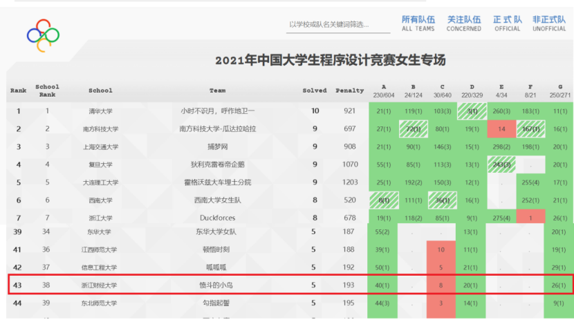 10月30-31日,由山东理工大学承办的2021年中国大学生程序设计竞赛女生赛在线上举行。来自清华大学、上海交通大学、浙江大学等161所高校的258支参赛队伍入围了决赛。由19计算机朱芳菲、赵露、20软工徐宇诺组成的“愤斗的小鸟”队发挥出色,获得一枚银牌。