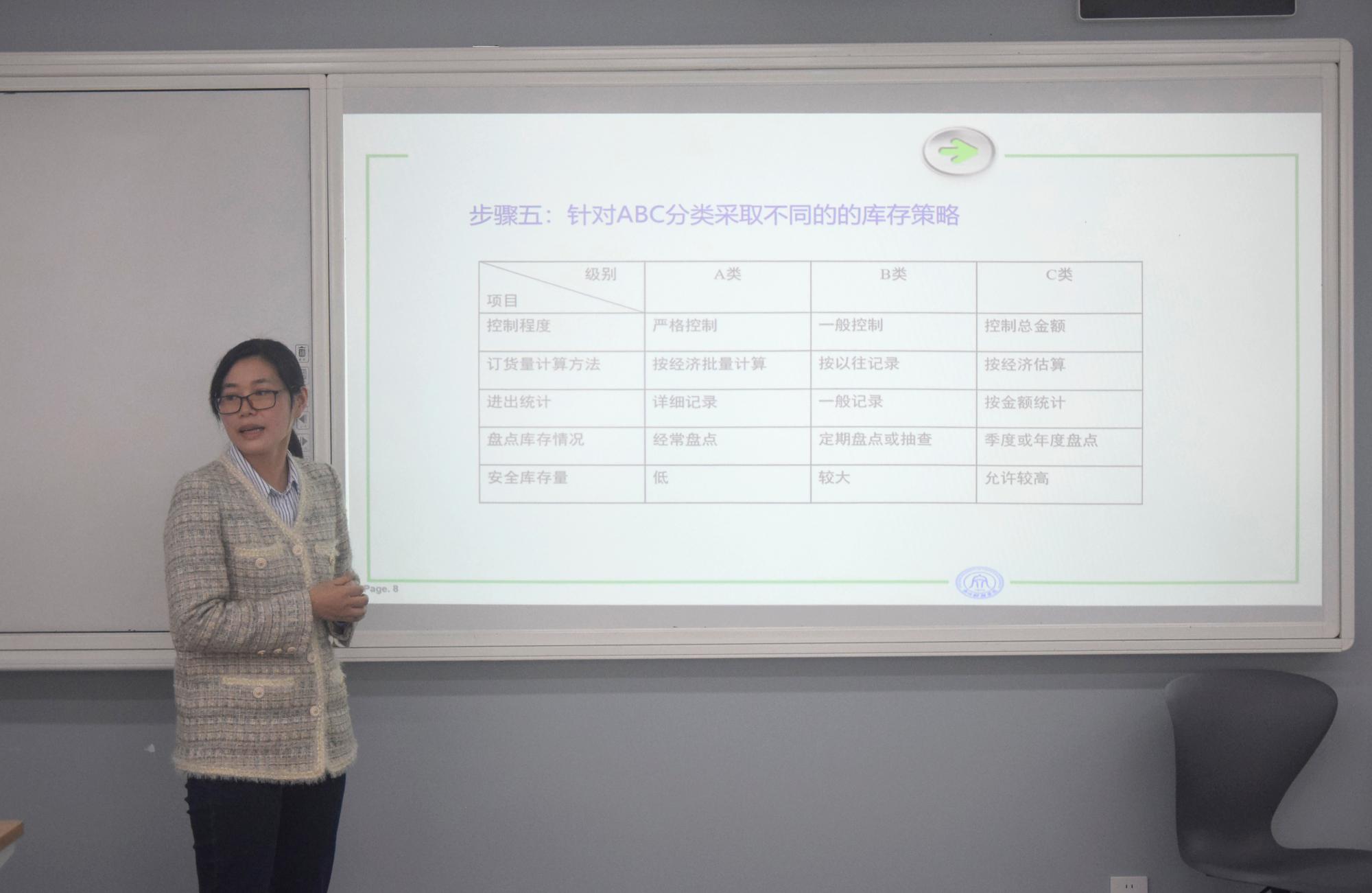 程小英老师以“库存管理教学设计”为主题,对现代物流与供应链管理课程进行教学设计汇报,从ABC库存管理法基础概念及其运用入手,引出经济订货批量(EOQ)库存控制模型和供应商管理库存等知识点的讲解,多方面优化整合教学方法、梳理知识体系,达到知识深化、行为内化的效果。