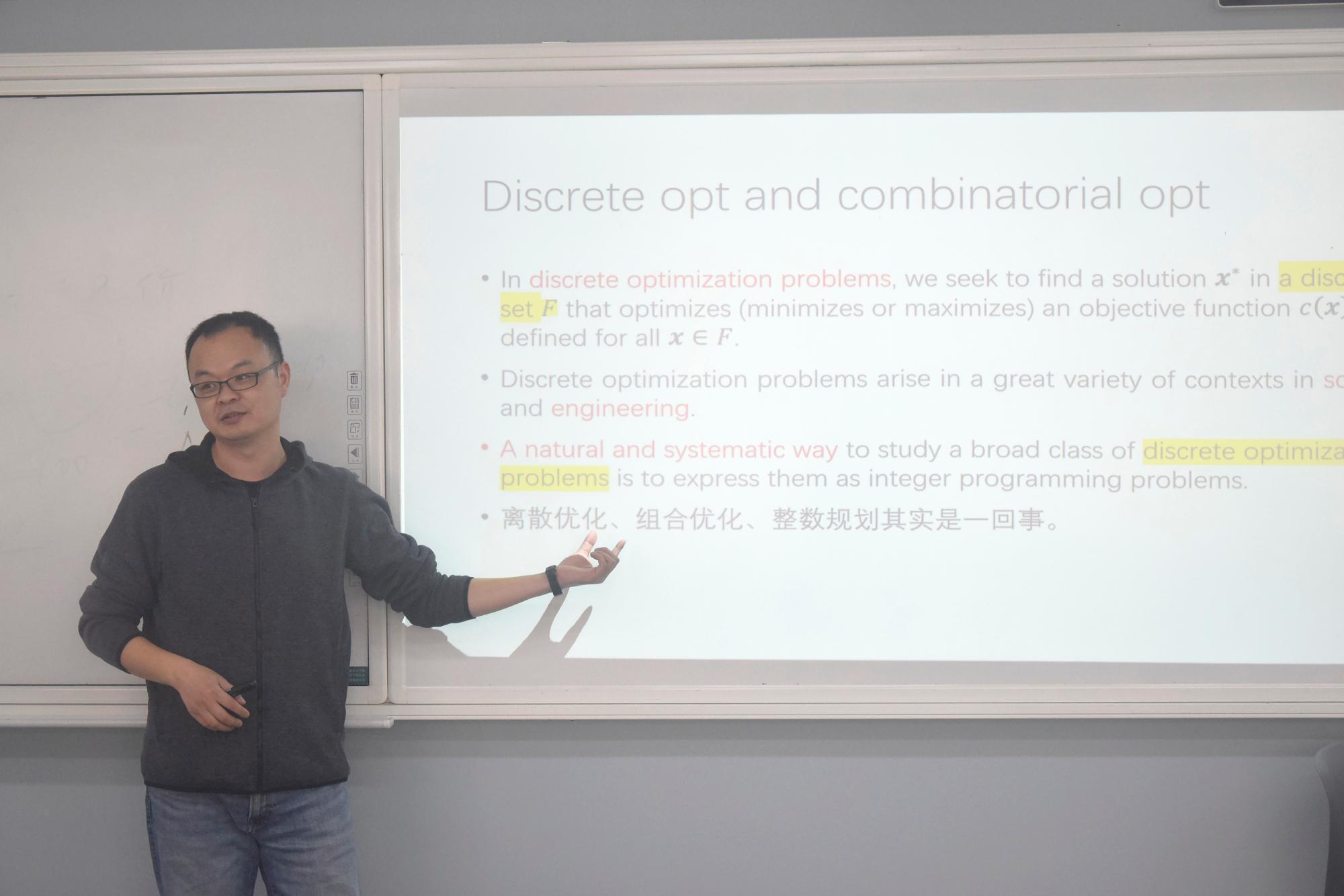 张树柱老师引入运筹优化原理与实践课程中“整数规划导论”部分,重点展示整数规划的意义及其转变逻辑,并扩展至整数规划在实践问题上的应用。通过剖析经典模型,张老师讲解了整数规划的建模方式与结构,并结合当前的学术研究前沿,展示了对研究生同学们从课堂学习跨越到学术研究的帮助。
